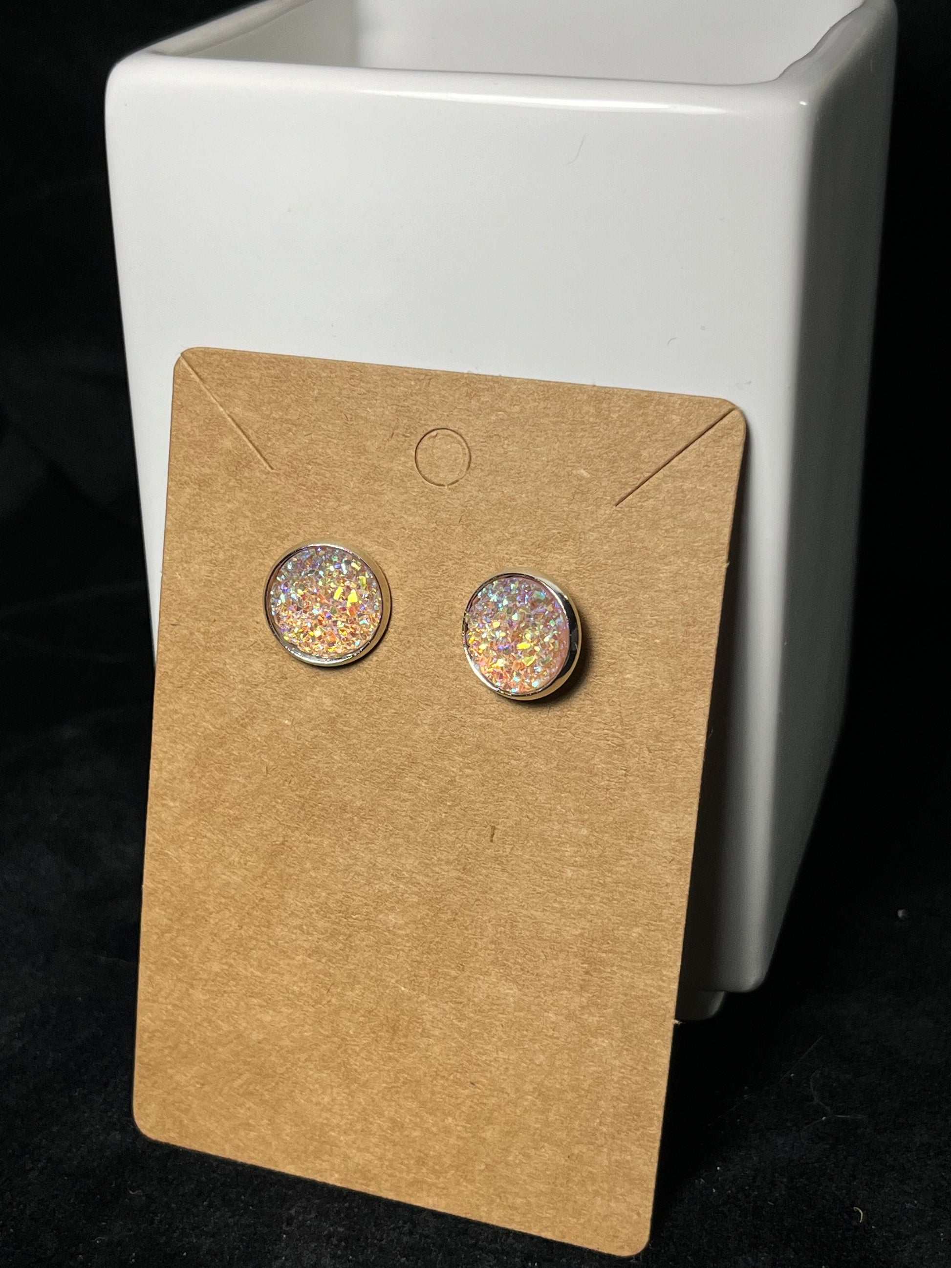 These studded earrings are 12mm round. They are hypoallergenic. The colors are swirly.