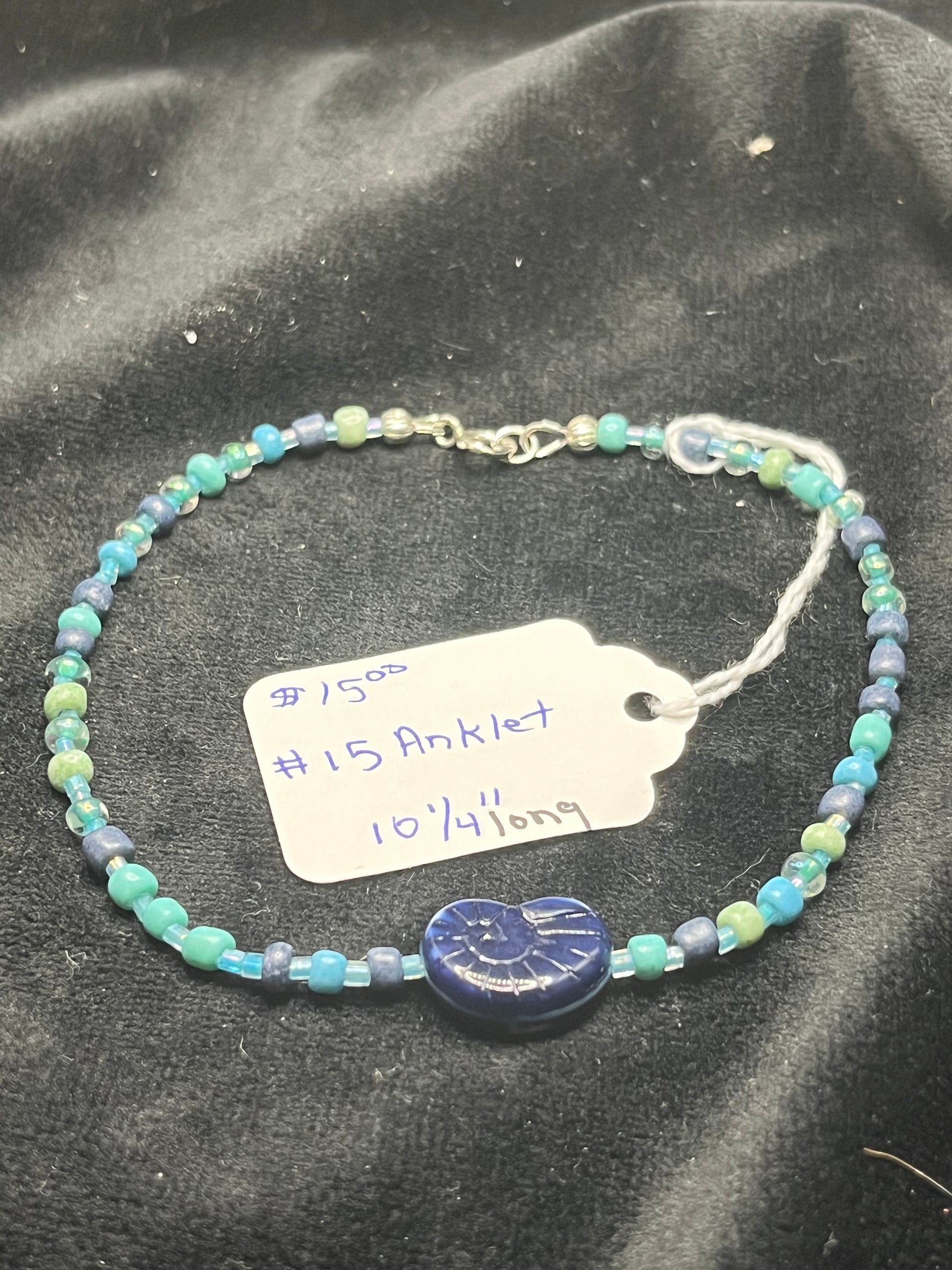 Blue and green bead anklet, blue shell focal bead 10.25”