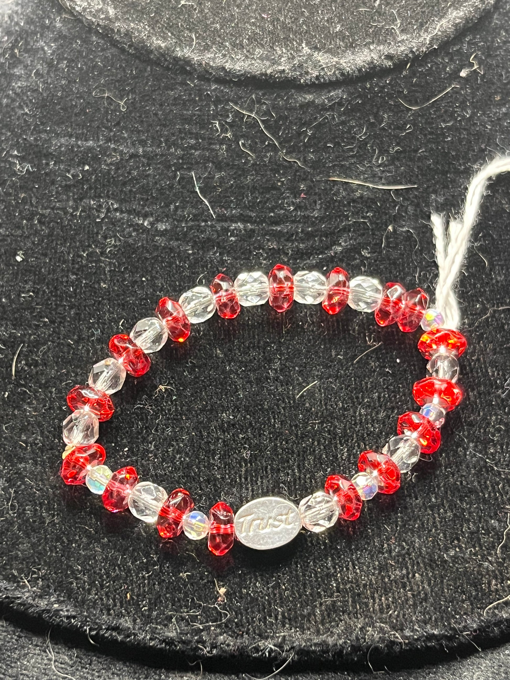 Red and white bracelet with “trust”charm