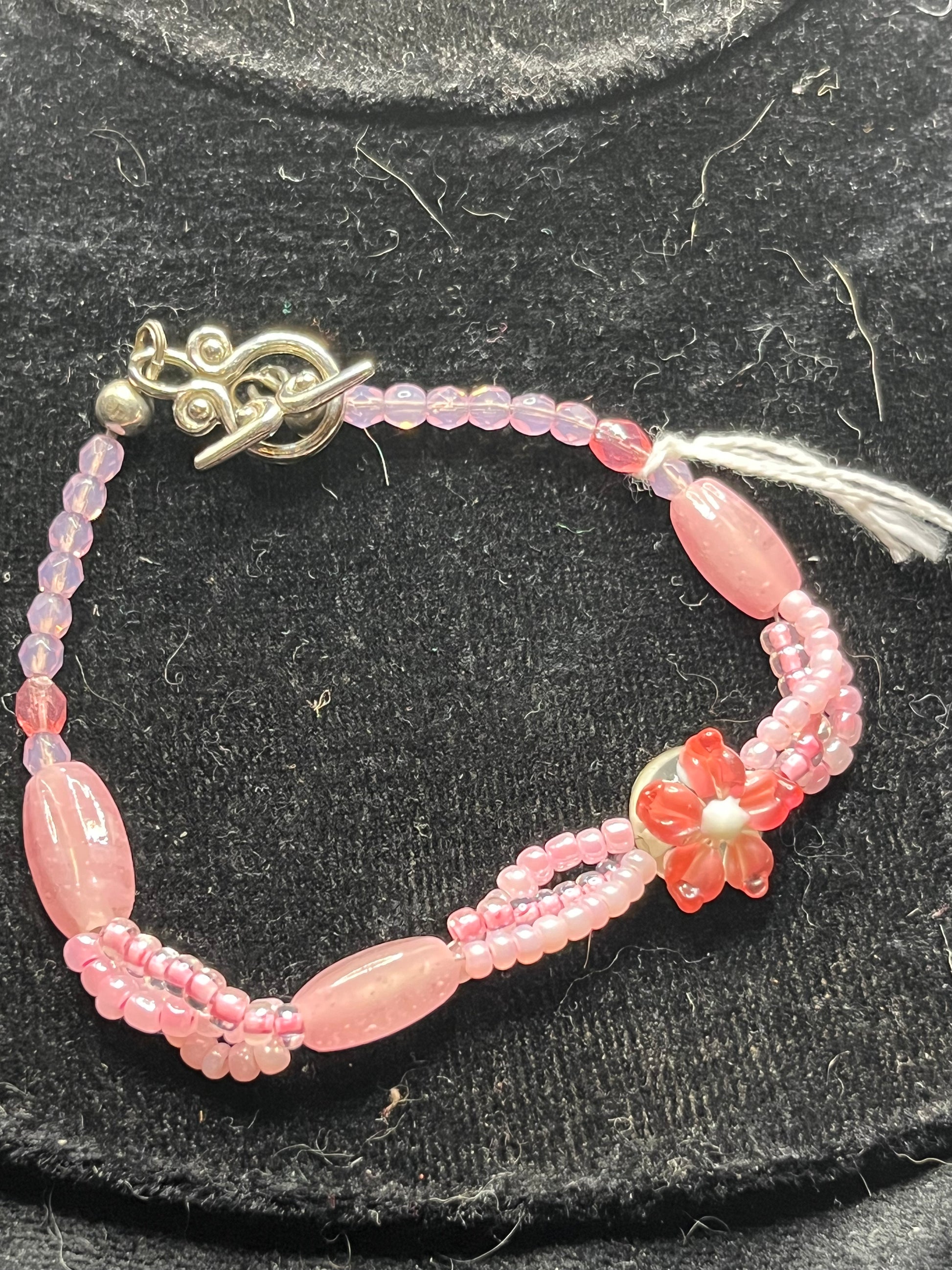 Pink seed bracelet with pink flower focal bead, larger wrist 8”