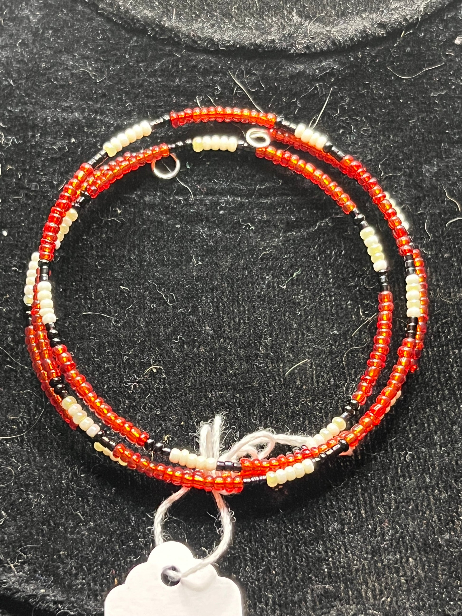 Wire wrapped bracelet with red white black seed beads