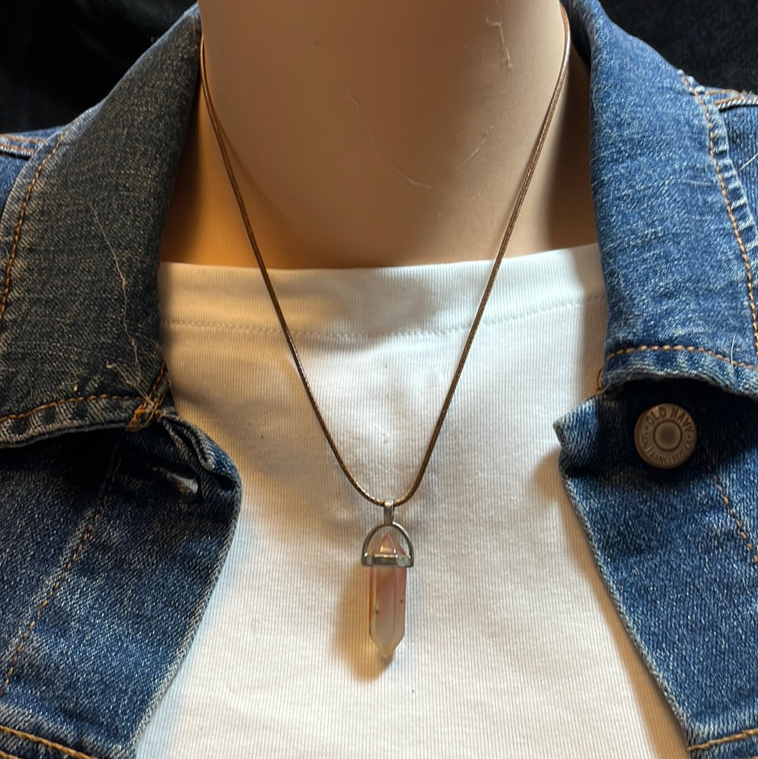 These necklaces have a brown leather cord. The crystal is a hexagonal stone, either natural or artificial stones.