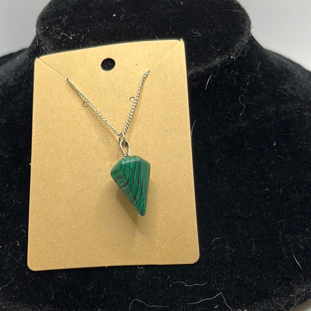 These gemstone charms are uniquely shaped and hung on an 18” silver or gold chain.