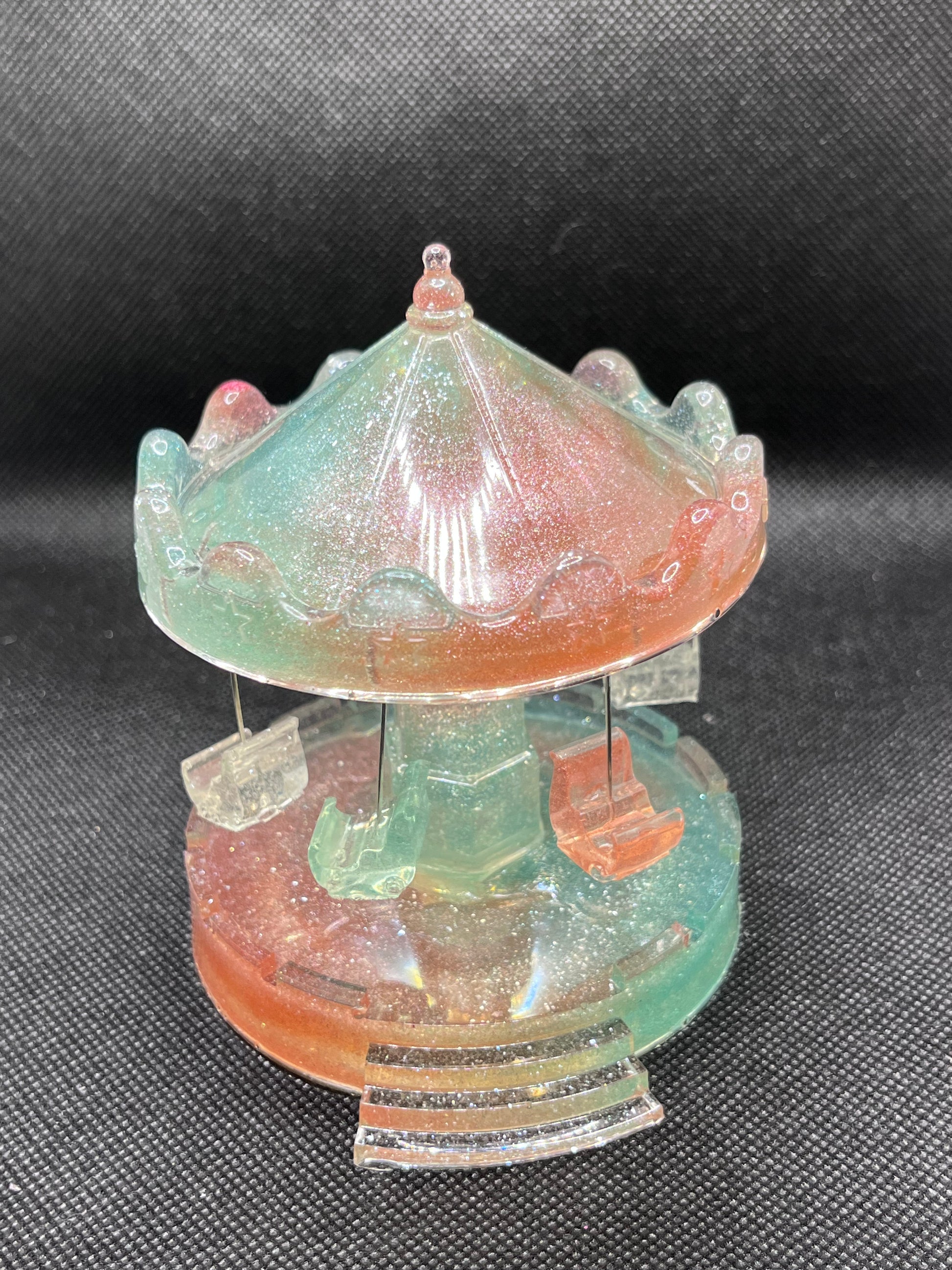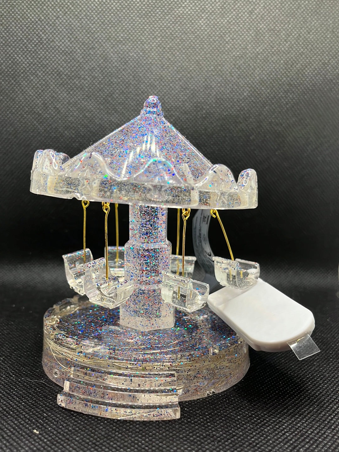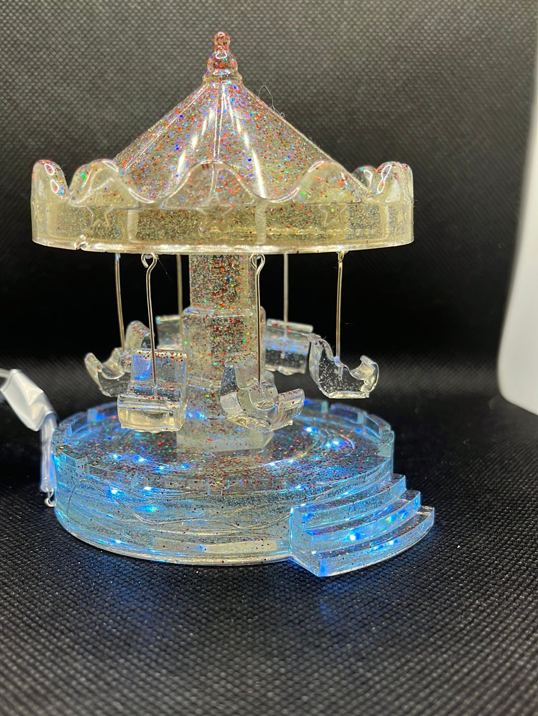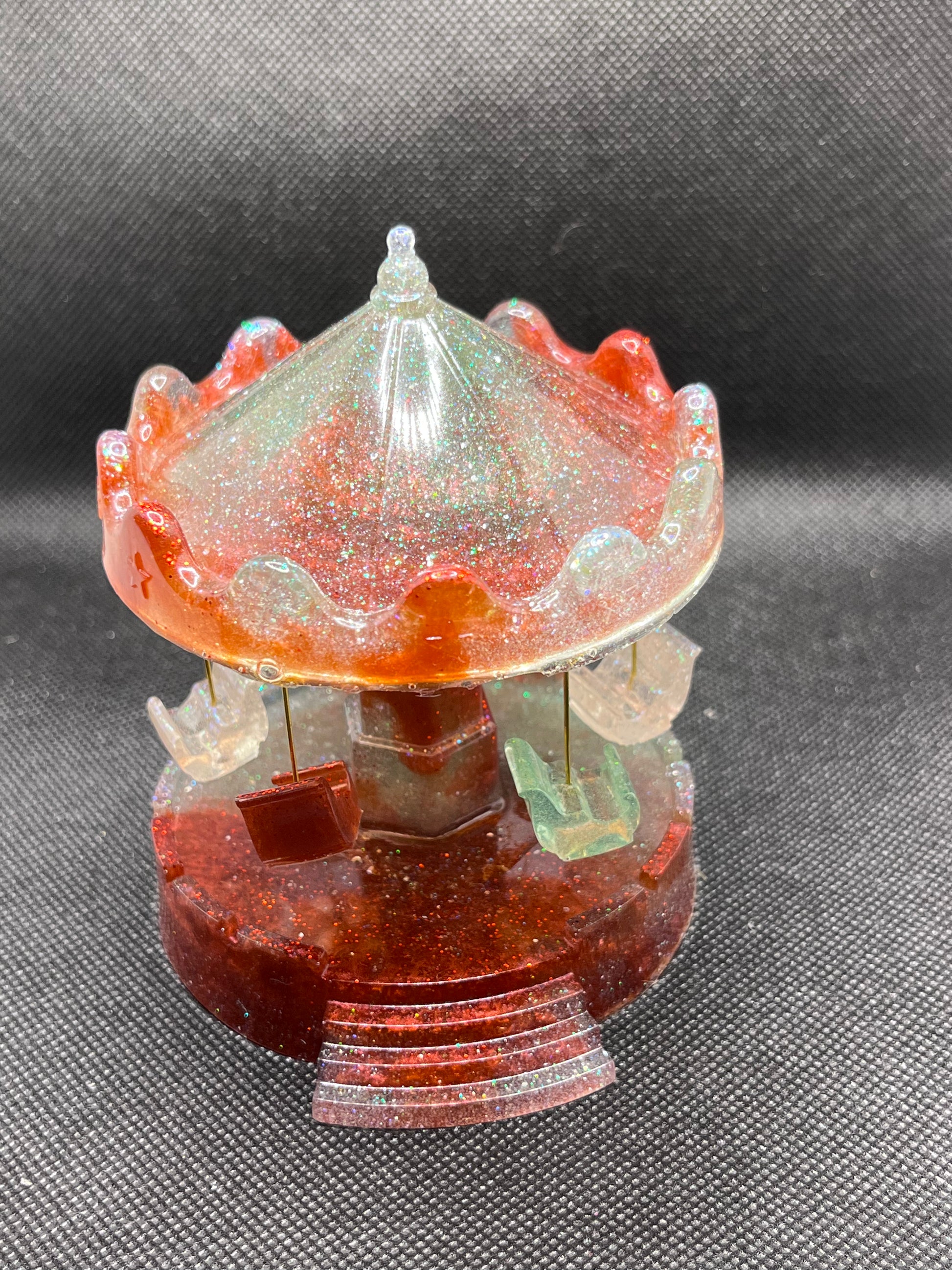 These cute little carousels are made with resin. The chairs swing back and forth. Some come with imbedded lights. You can even custom order a color by leaving a note at checkout.