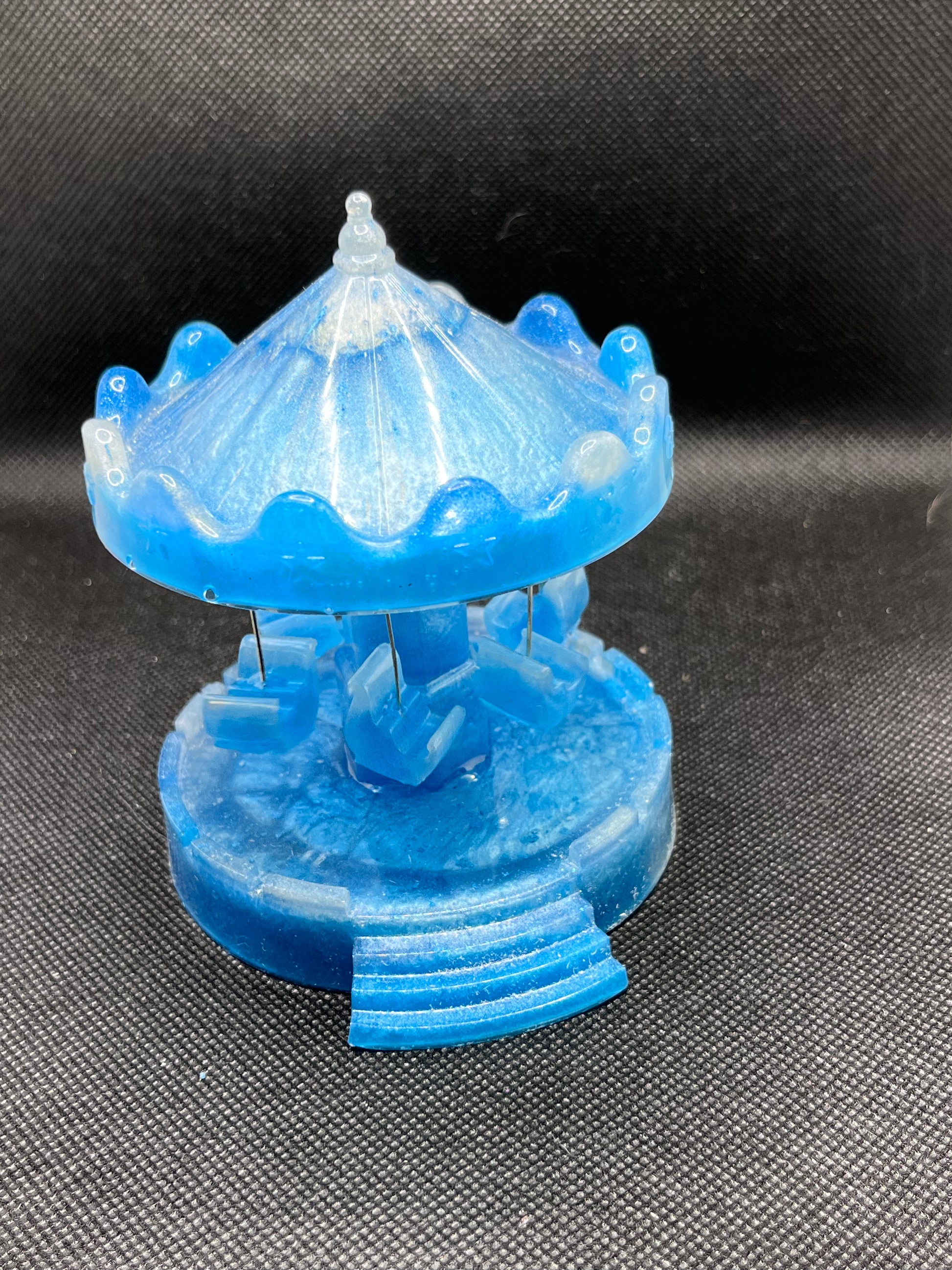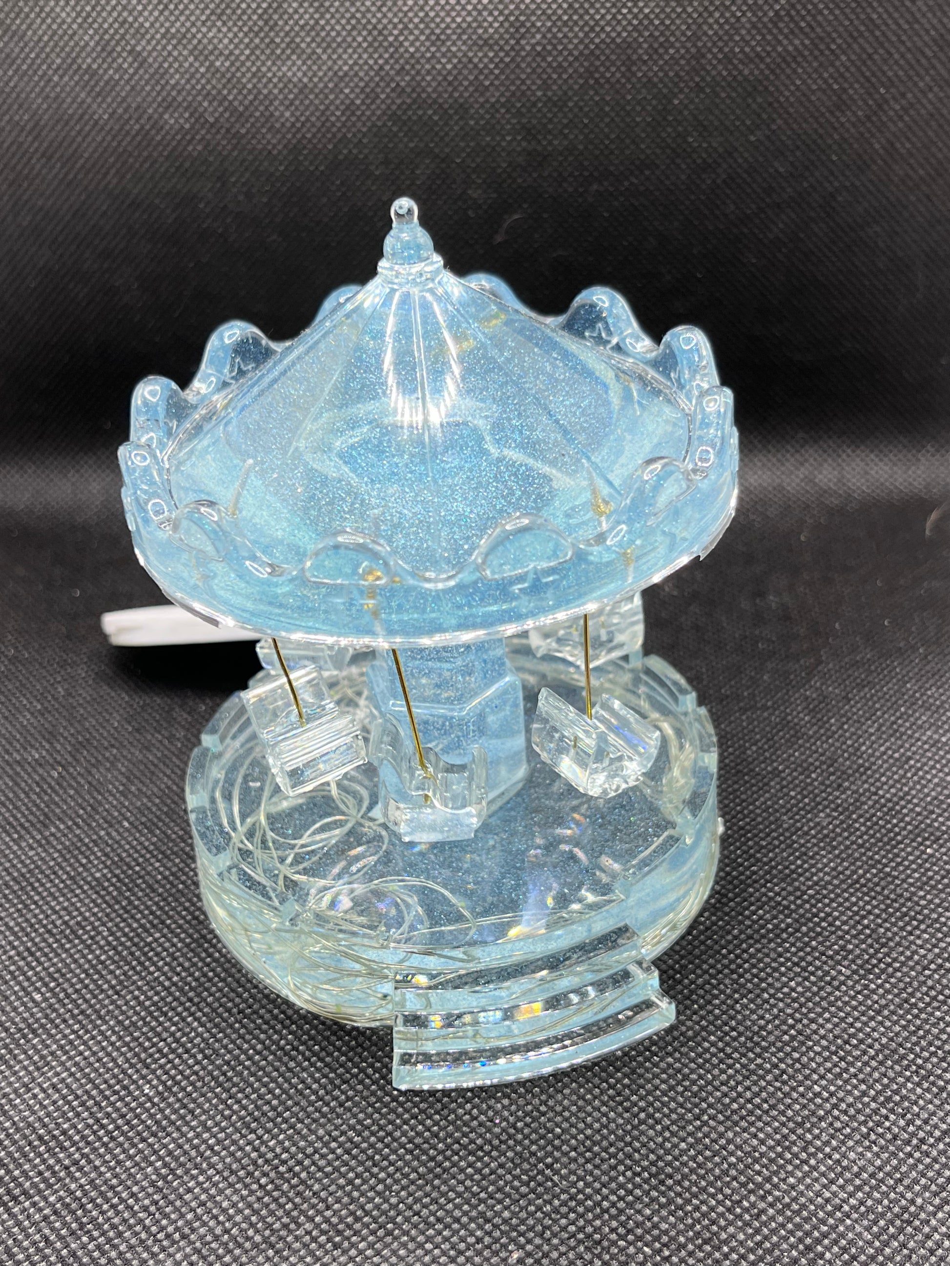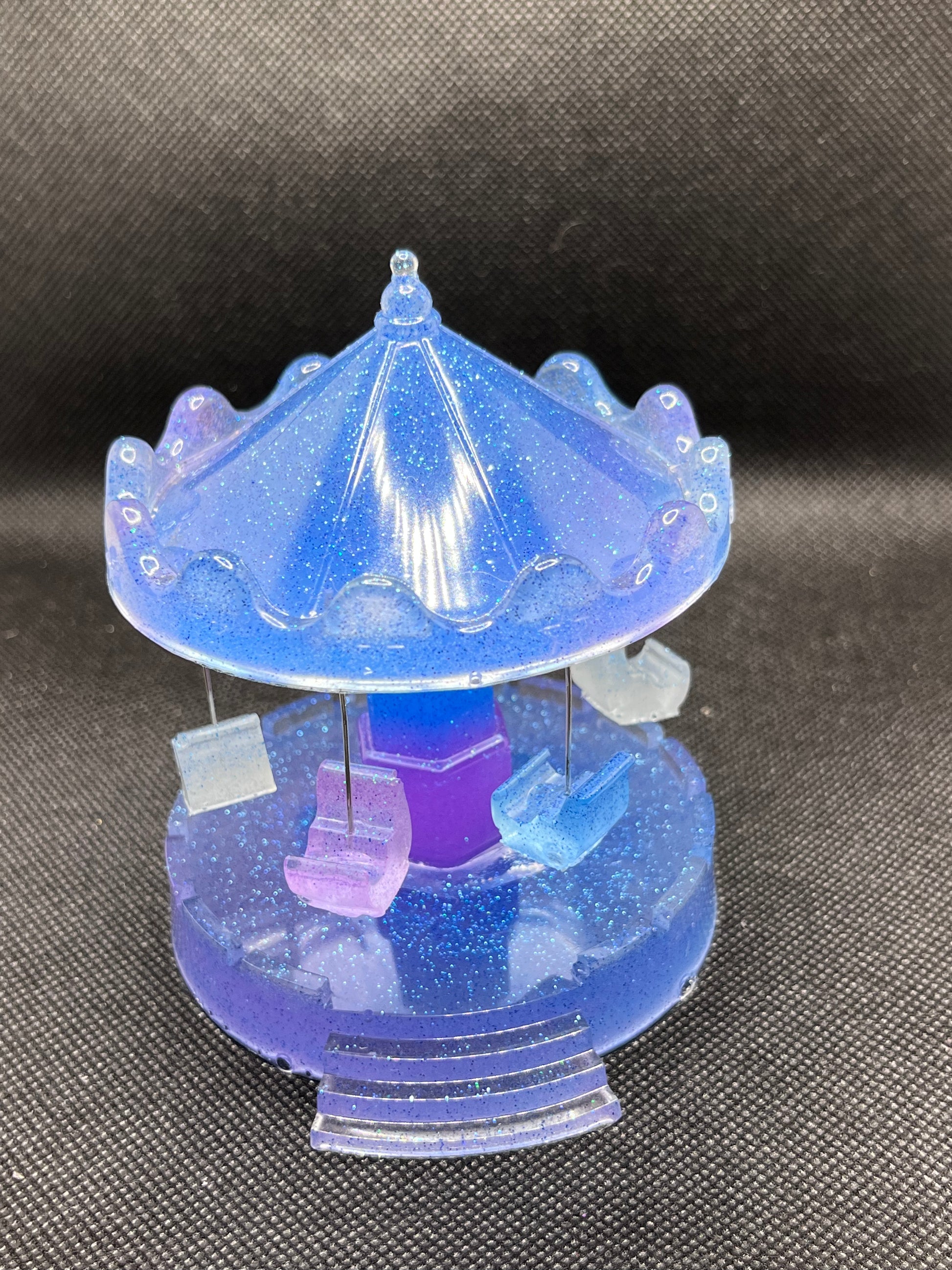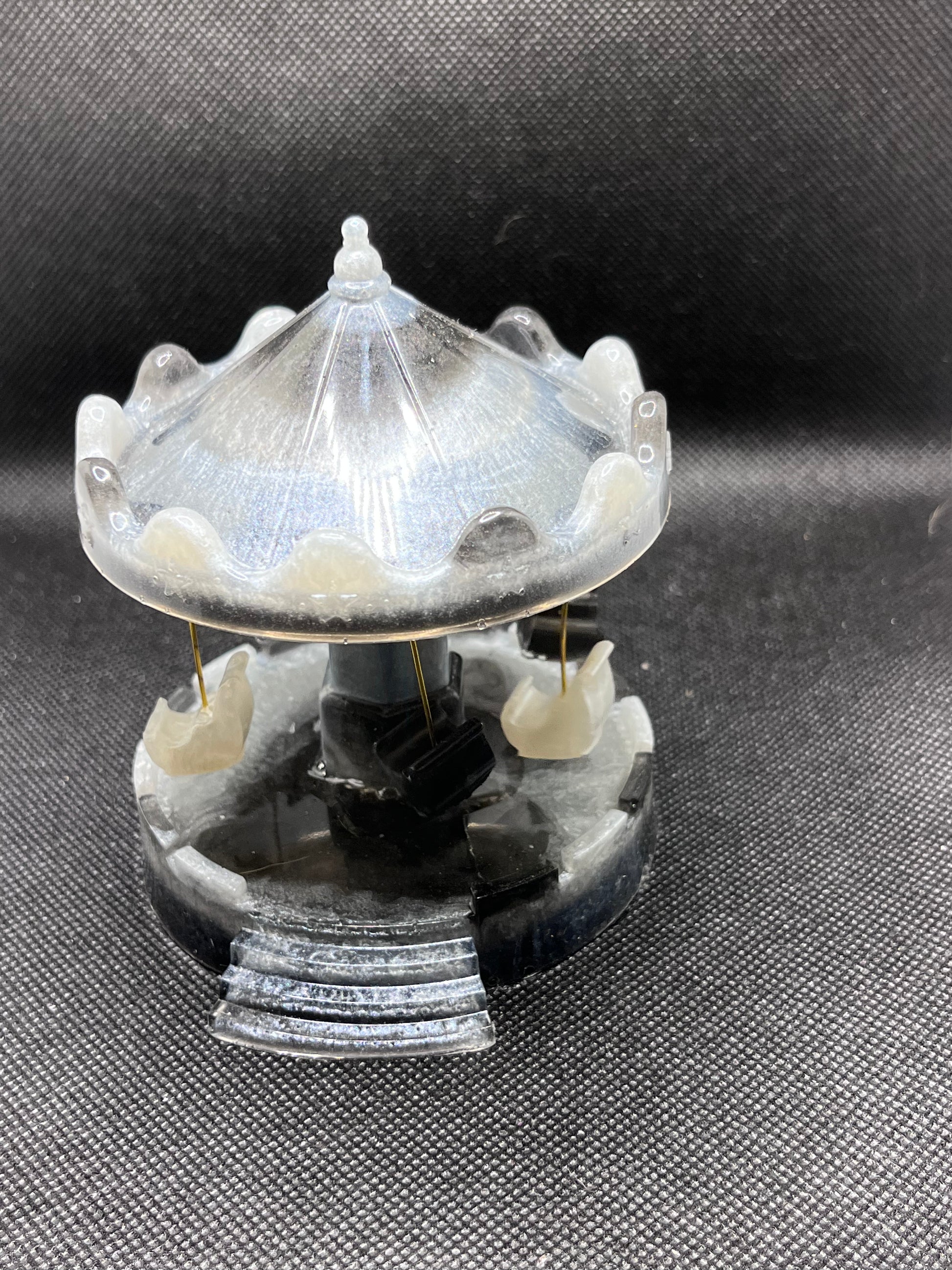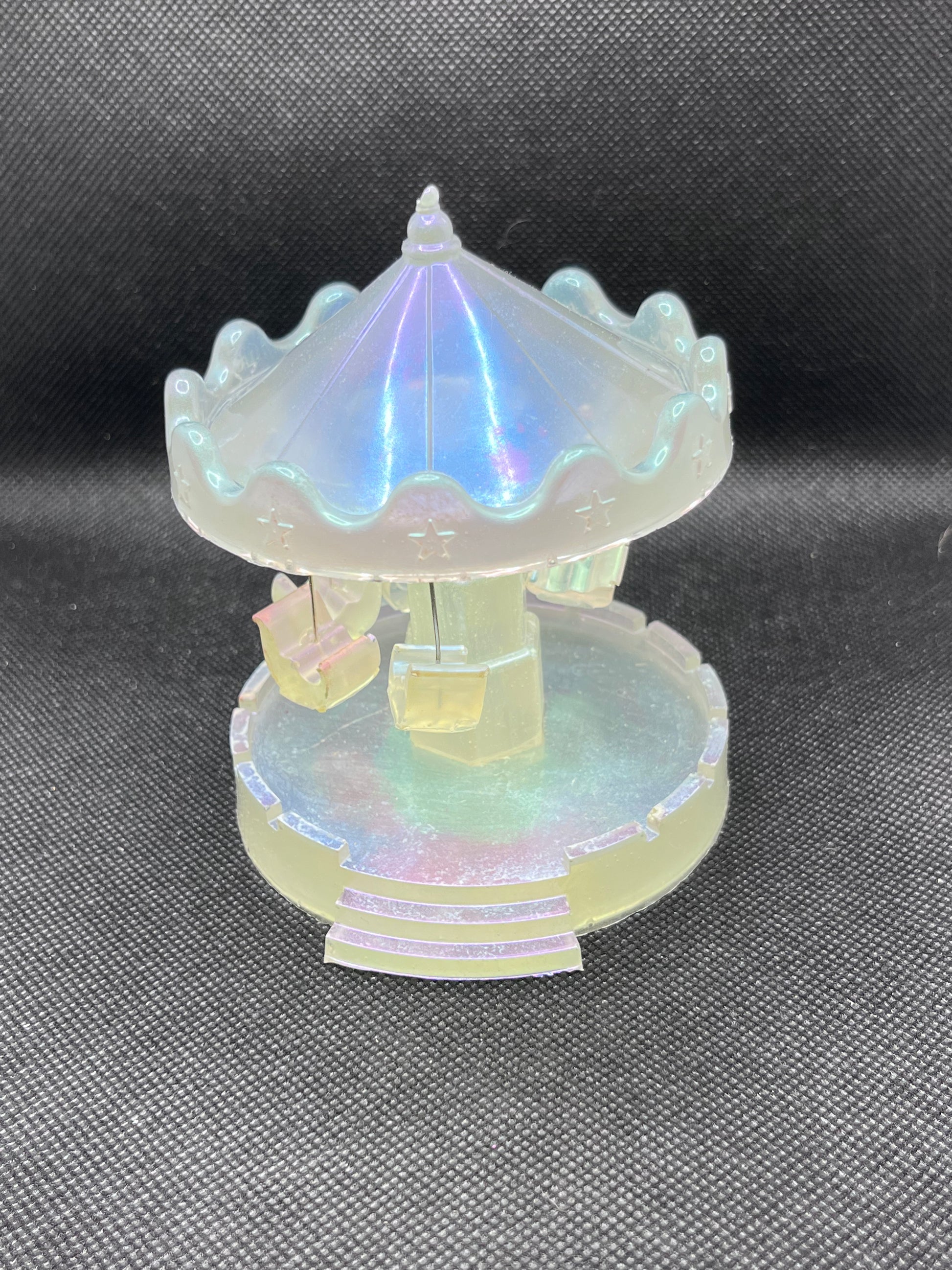 These cute little carousels are made with resin. The chairs swing back and forth. Some come with imbedded lights. You can even custom order a color by leaving a note at checkout.