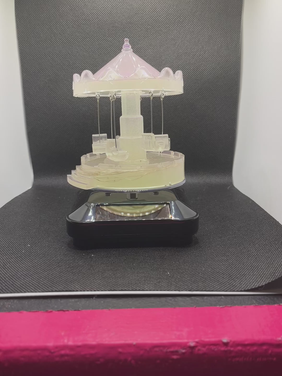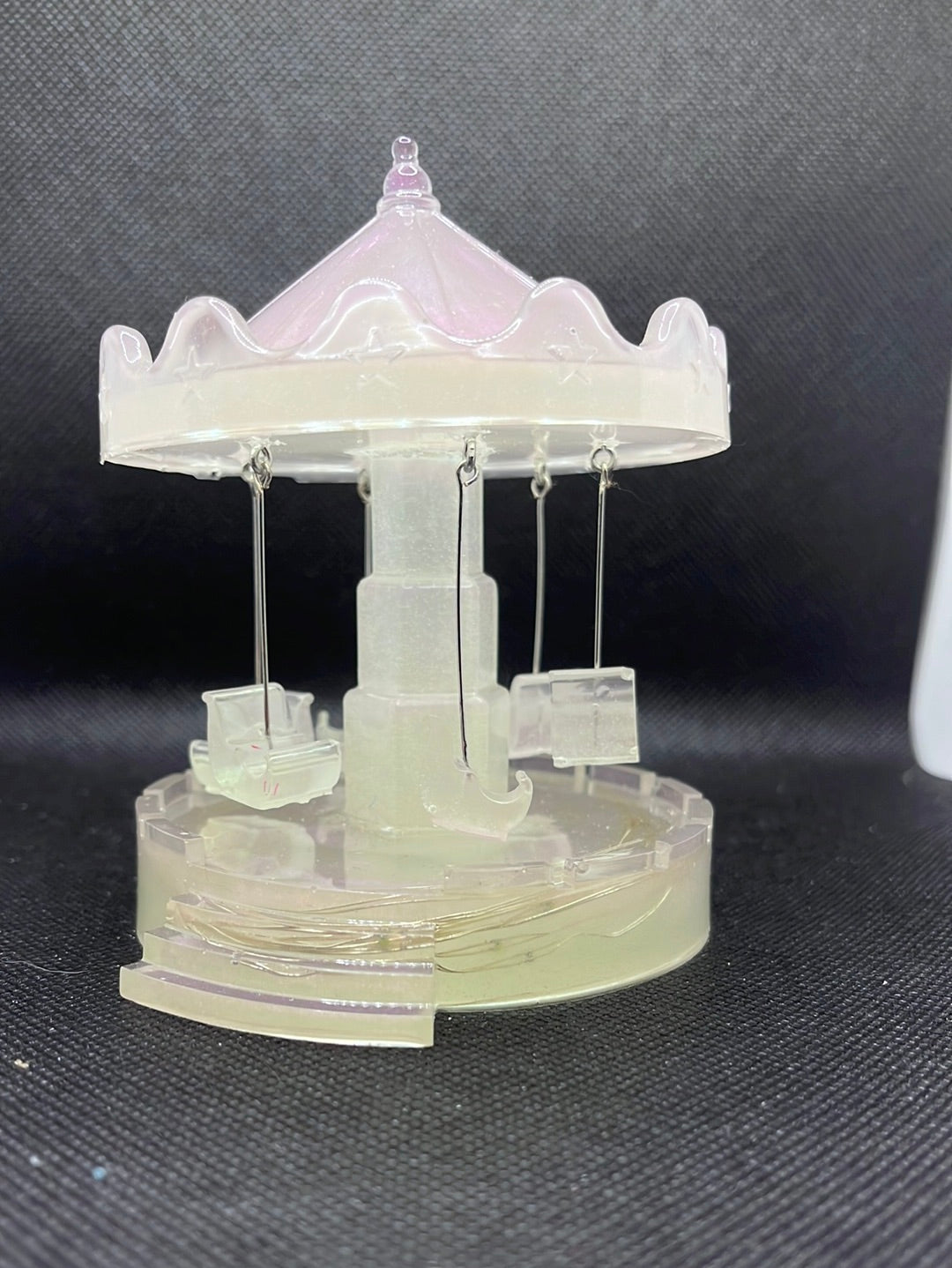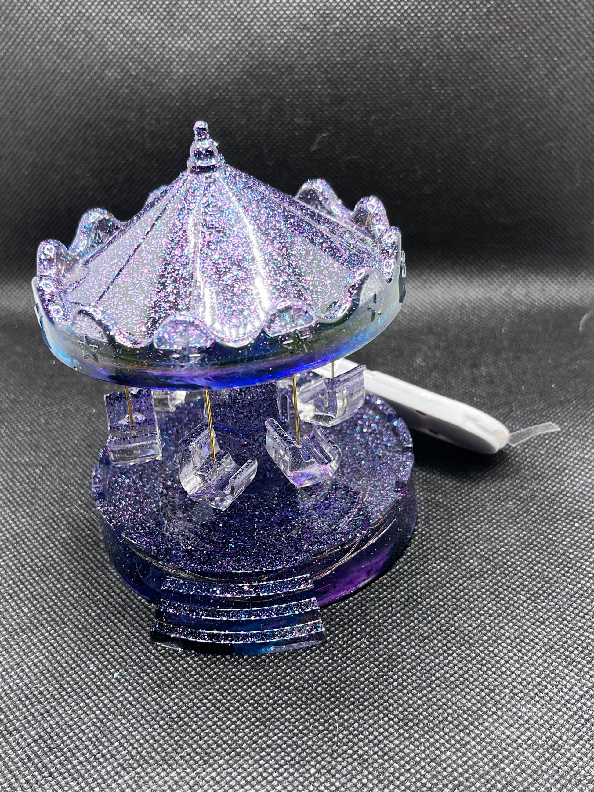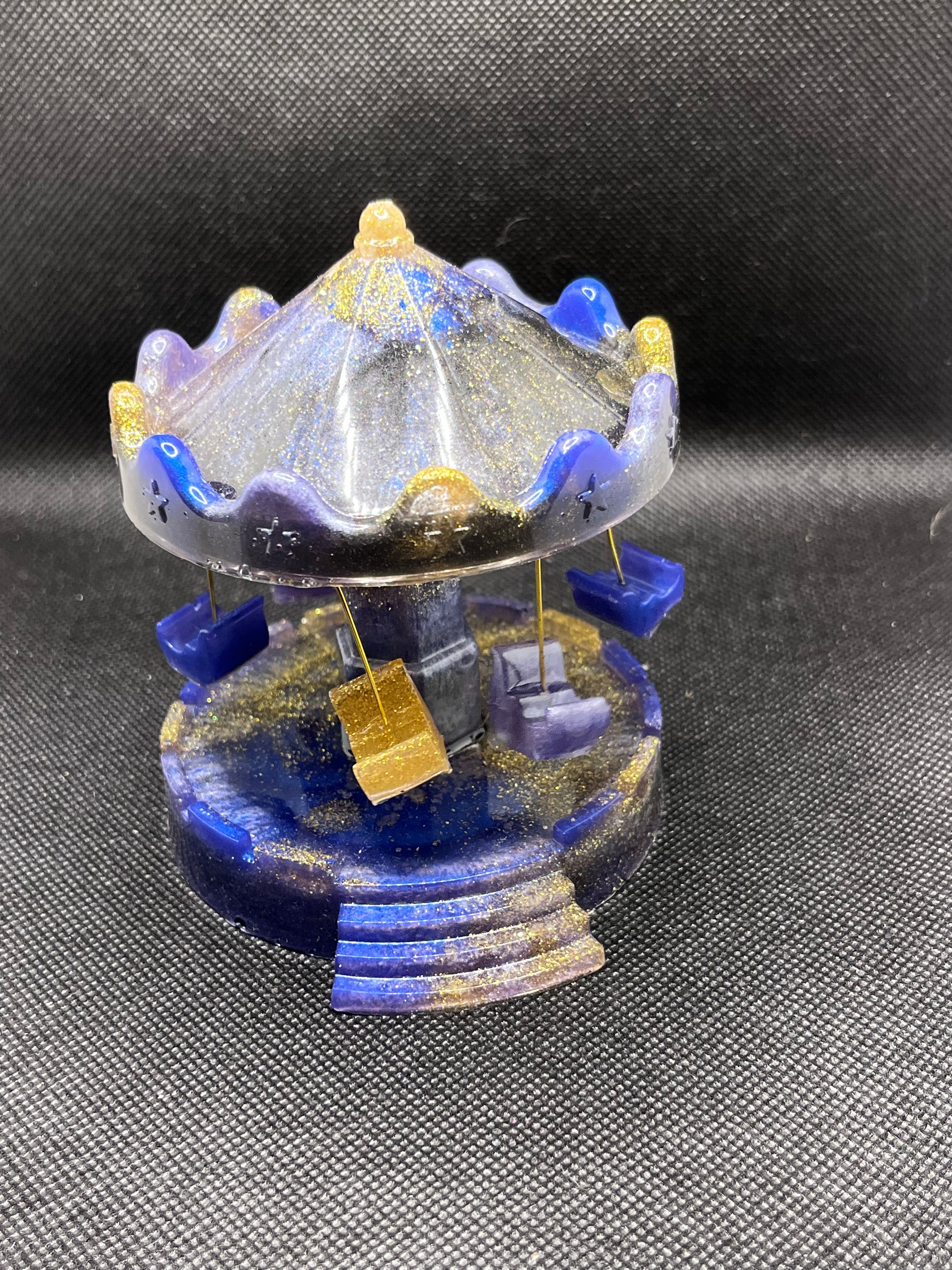 These cute little carousels are made with resin. The chairs swing back and forth. Some come with imbedded lights. You can even custom order a color by leaving a note at checkout.