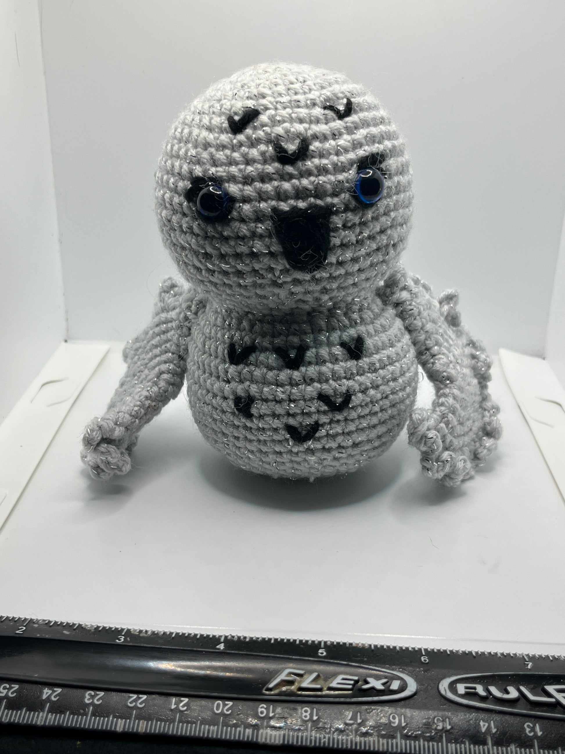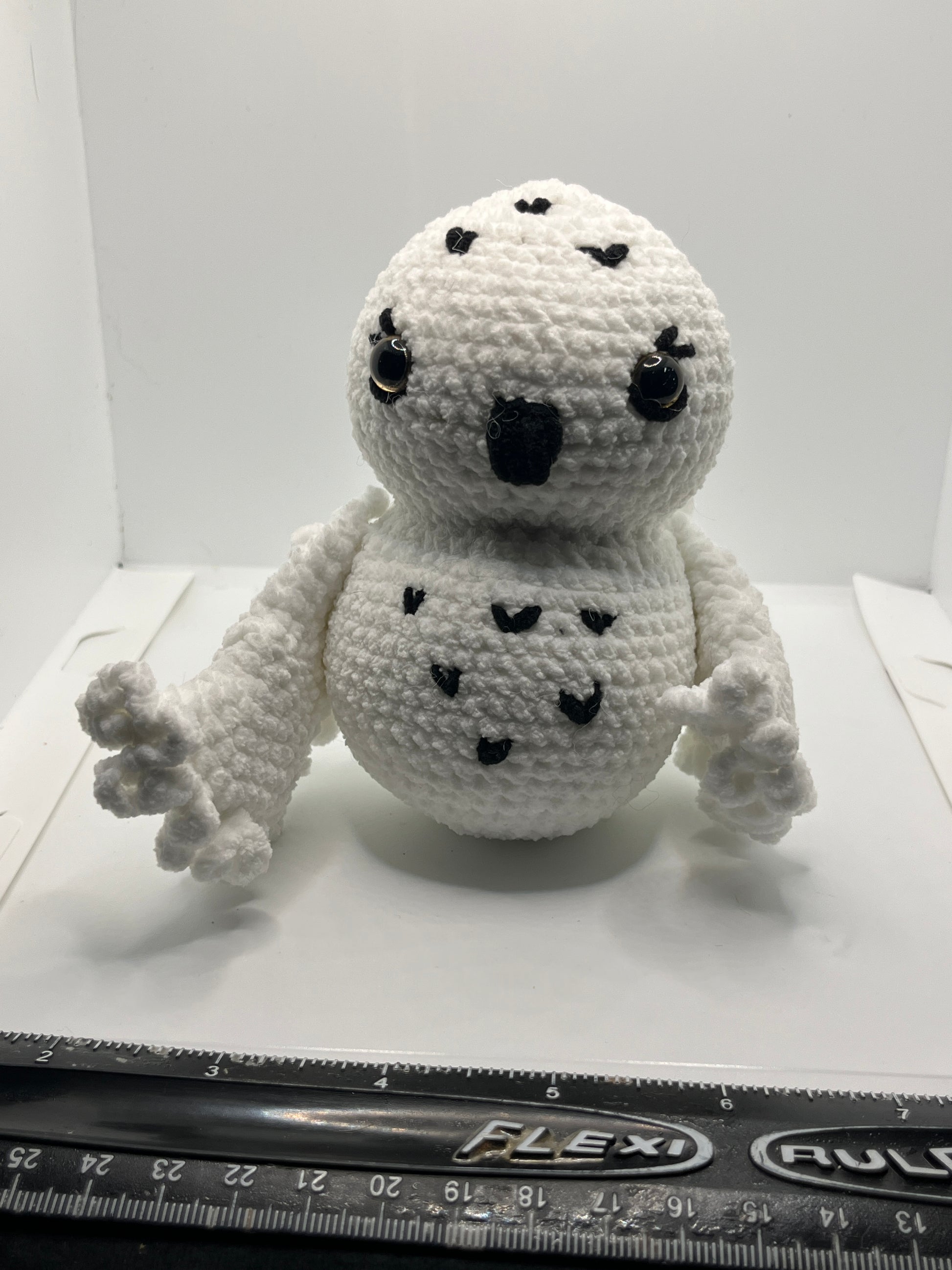 This cute little snow owl measures about 8” tall and is great for snuggling or using as a decoration