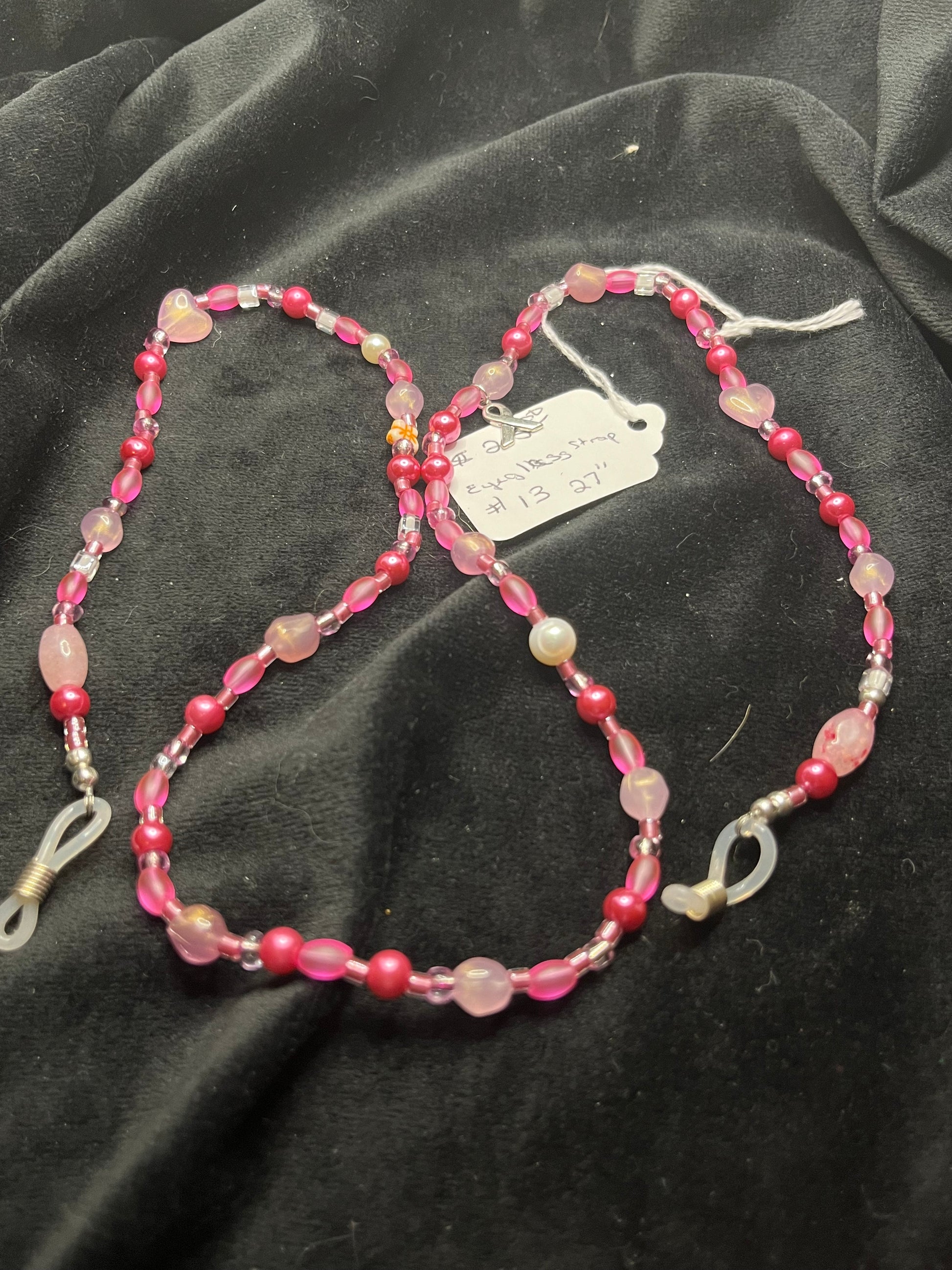 Bright pink bead eyeglass strap with awareness ribbon, 27”