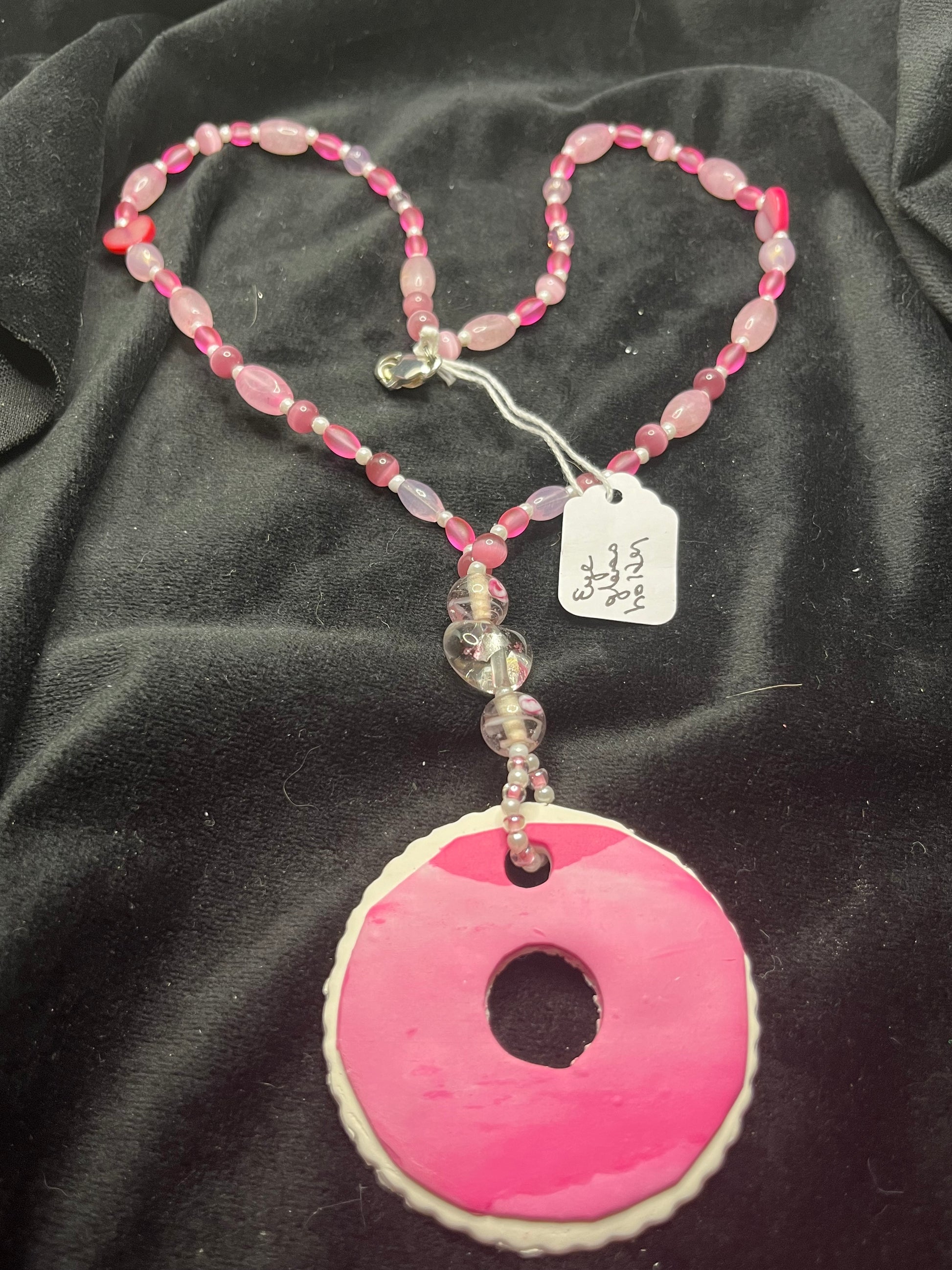 Pink bead eyeglass necklace; pink “donut” focal for hanging glasses from