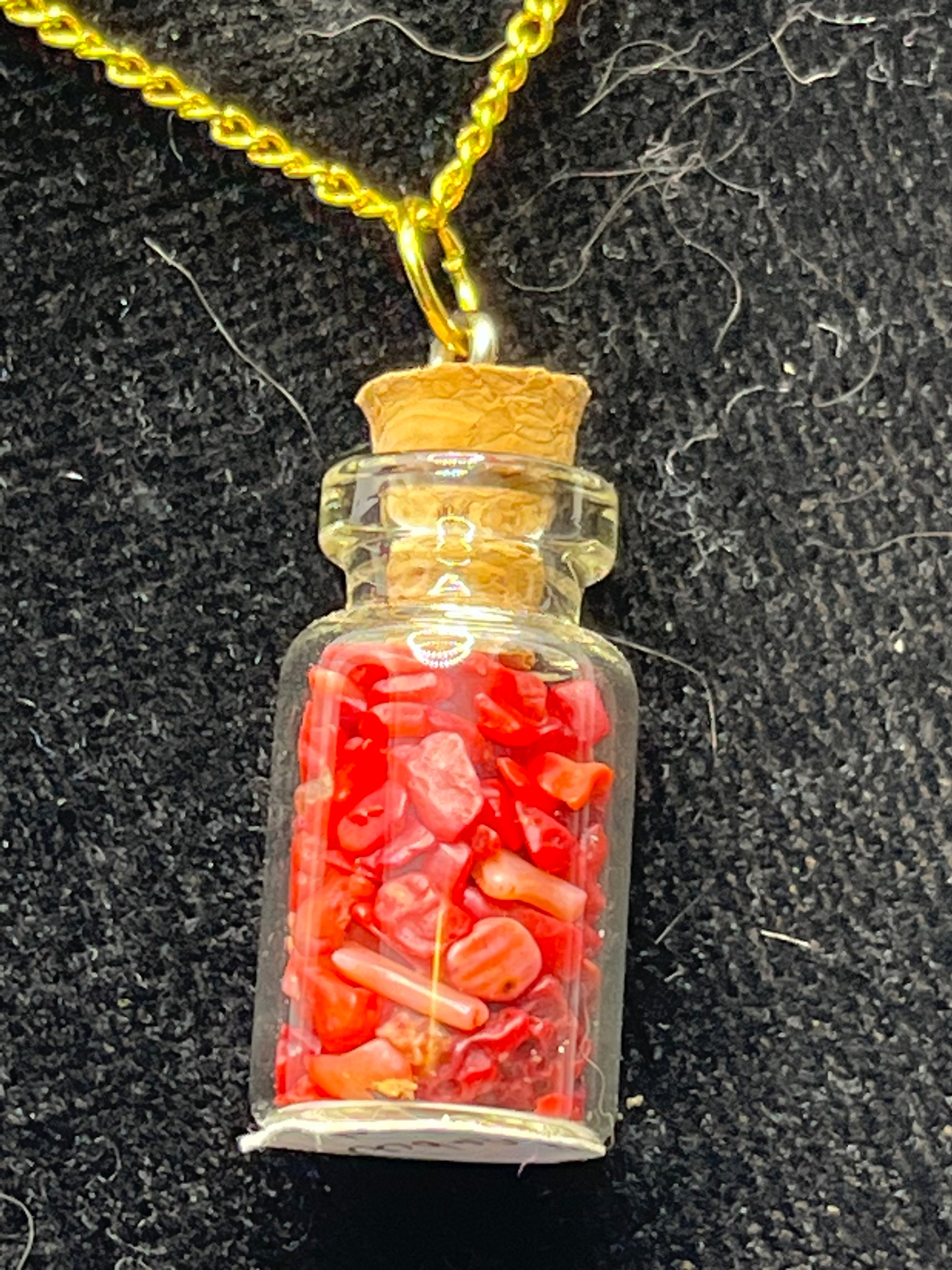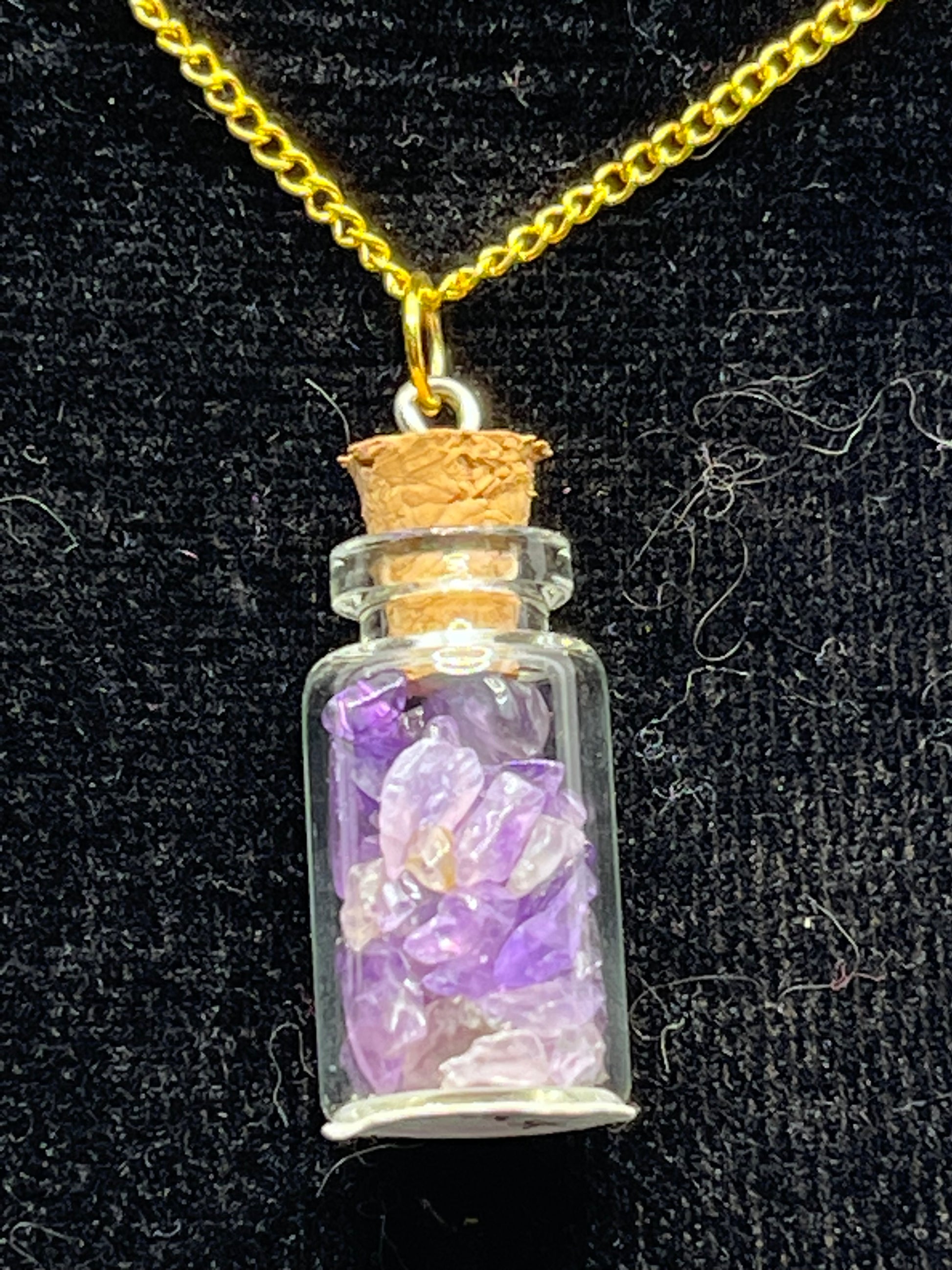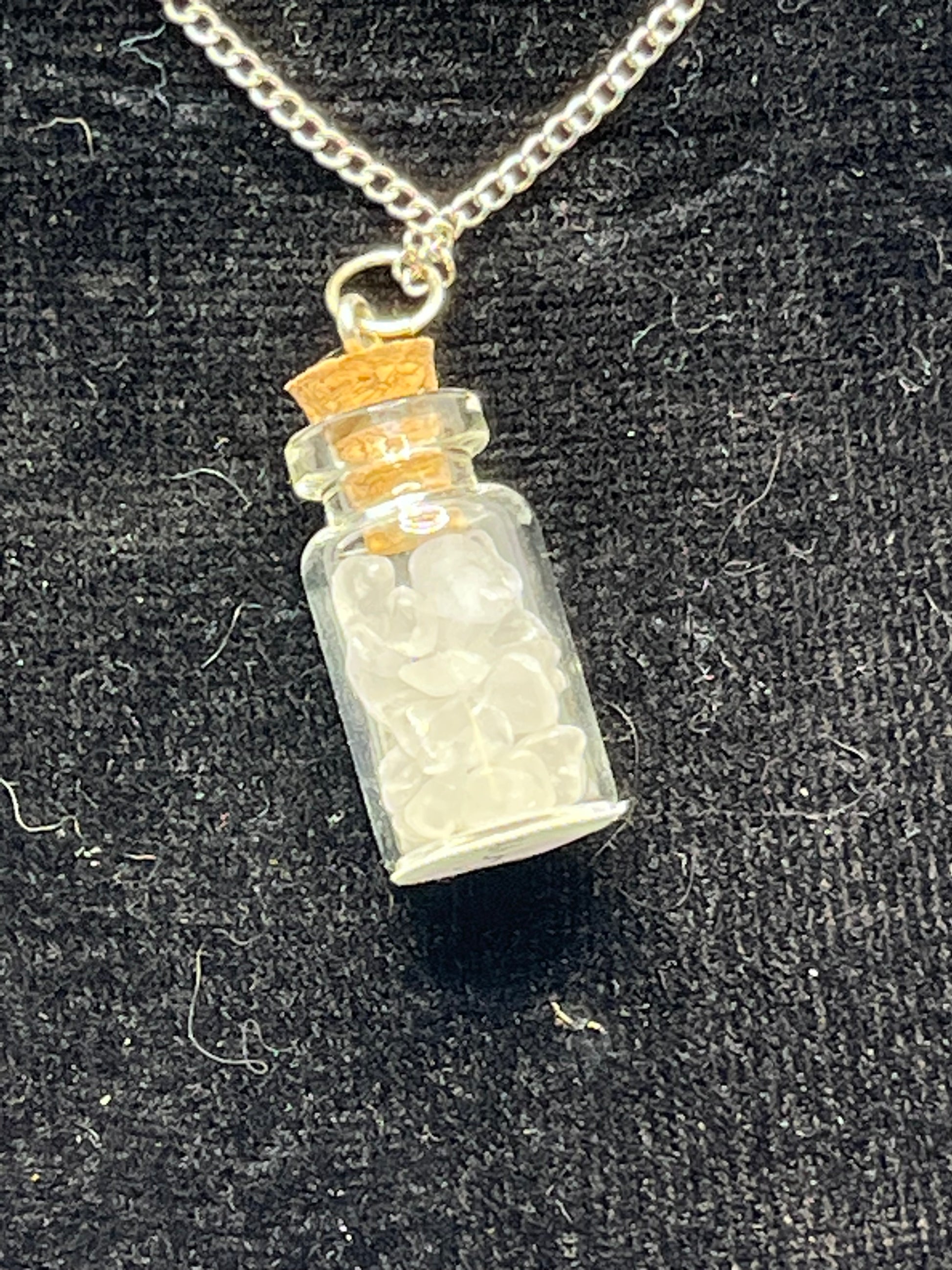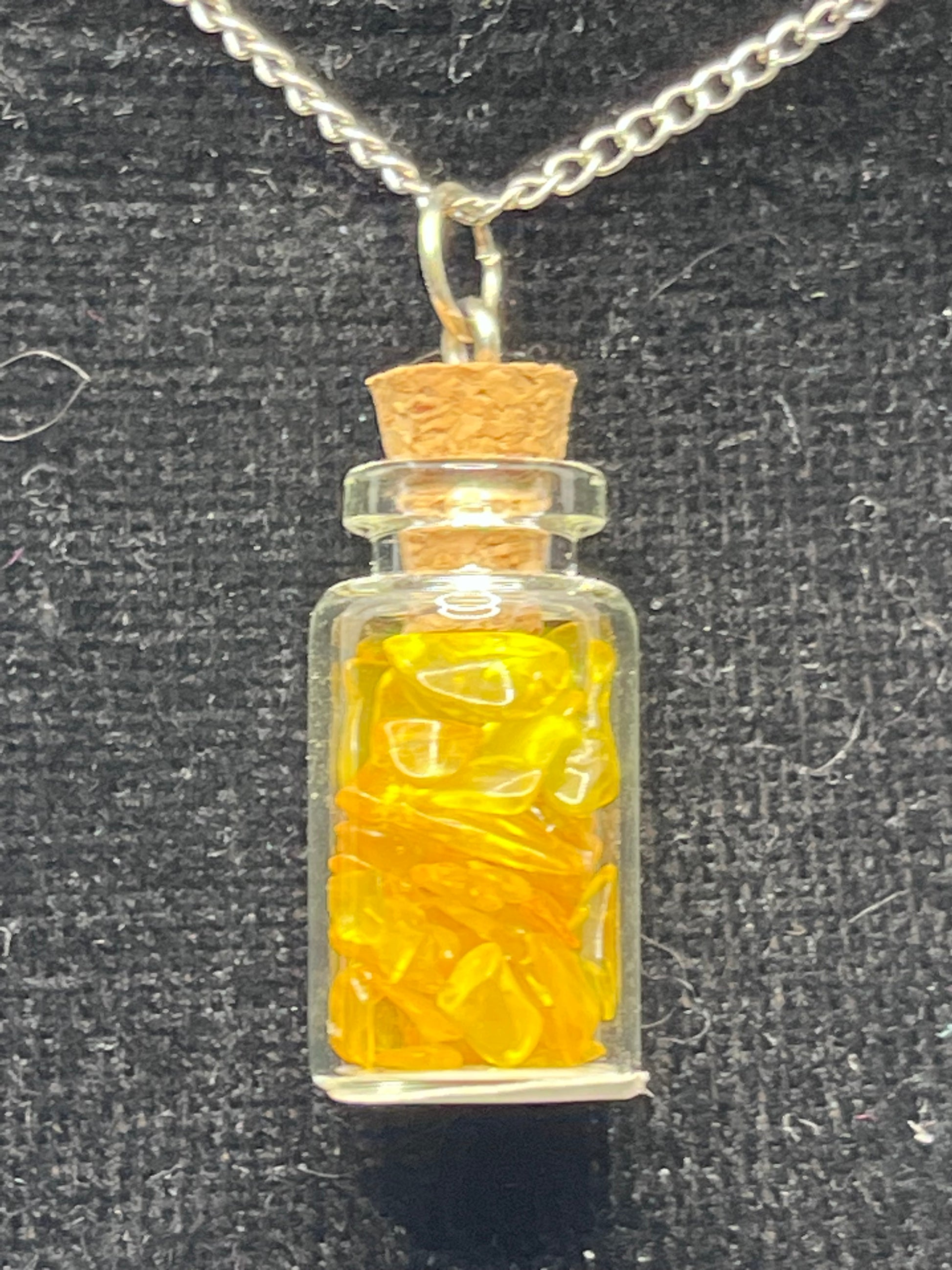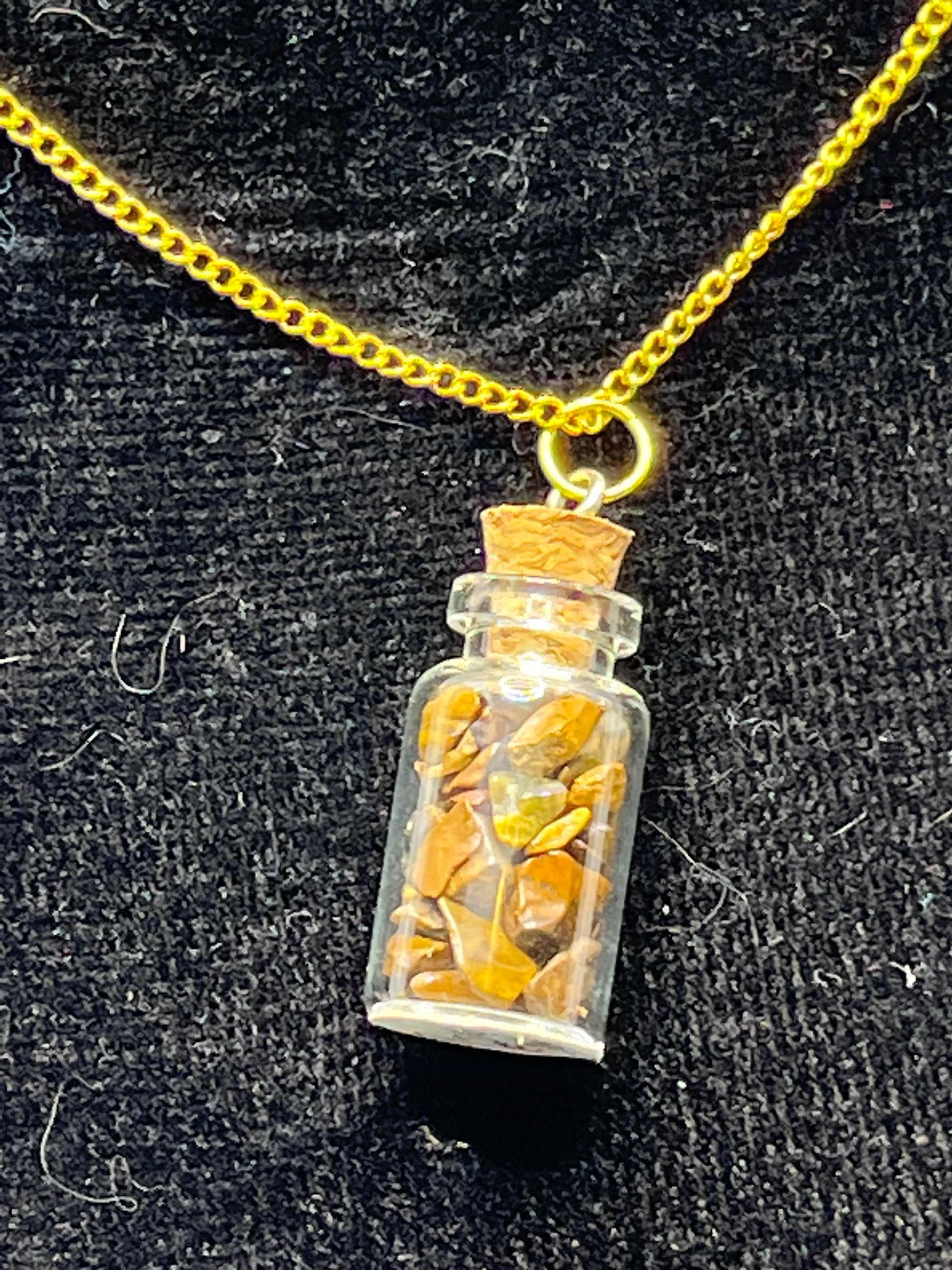 These cute little jars are filled with natural gemstones. Just the perfect size to hang on a necklace around your neck. Chain is 18"
