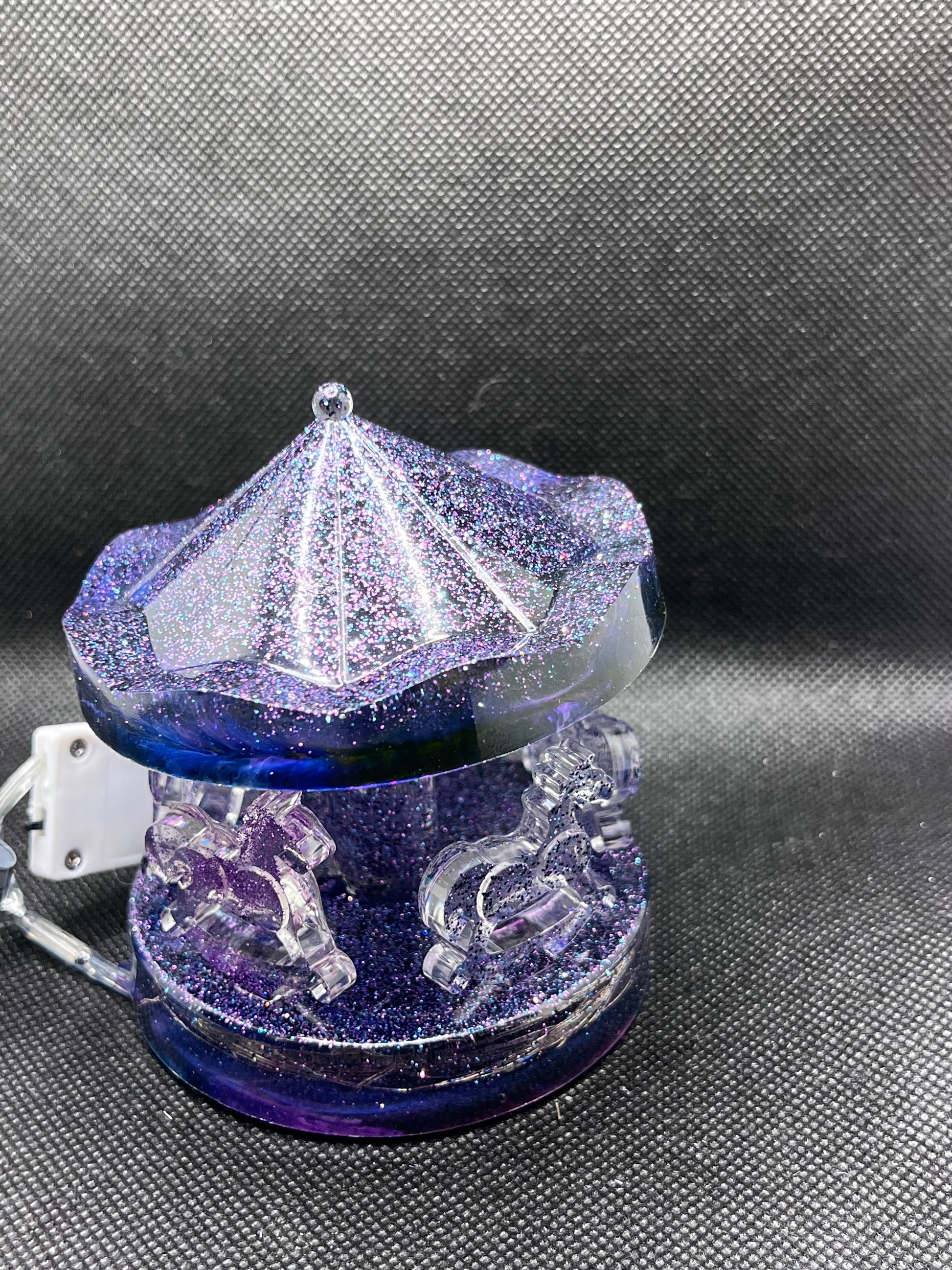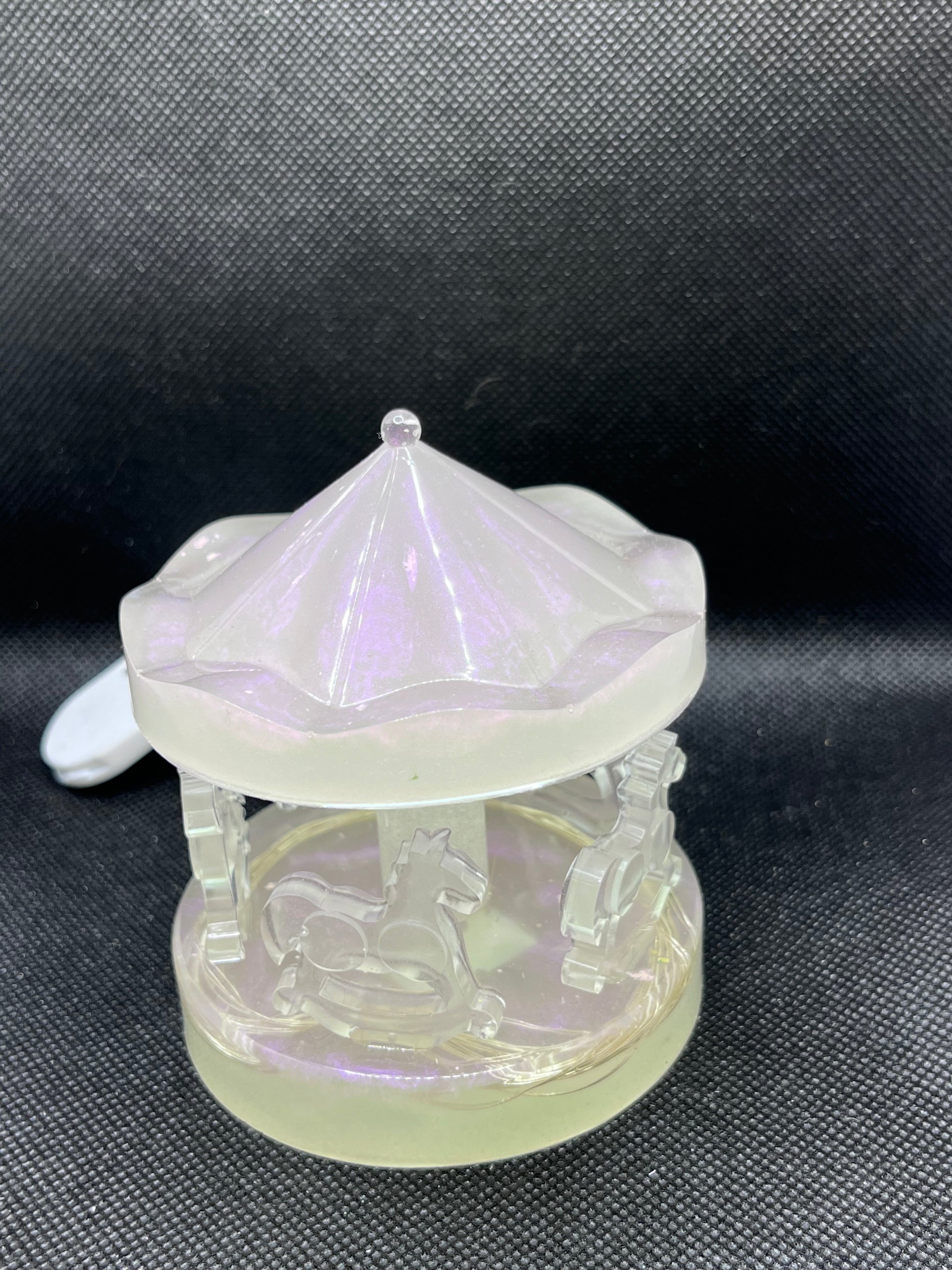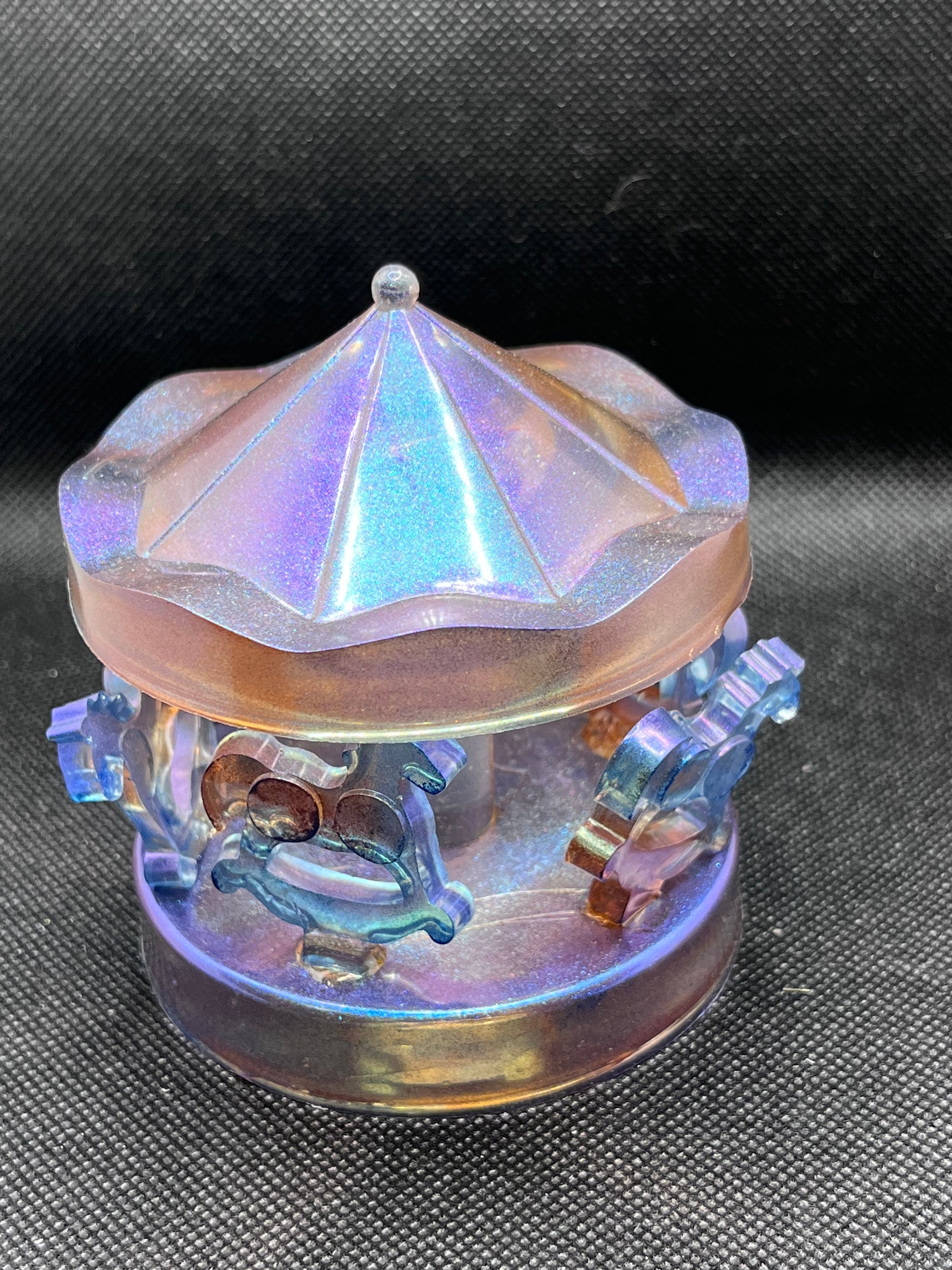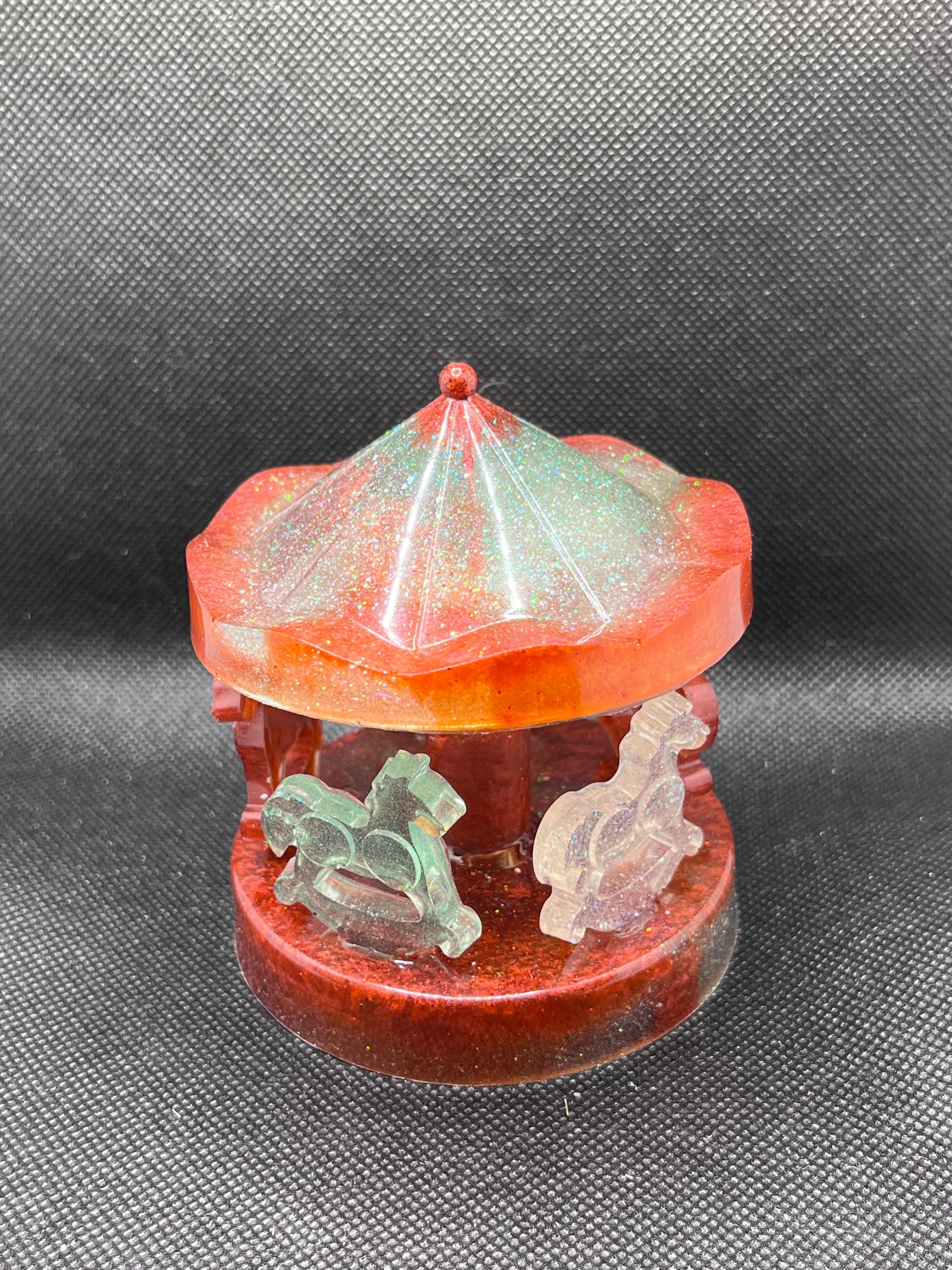 These decorative carousels are made out of resin. They have galloping horses depicted on them. Some have lights embedded in them. If you have a custom color you would like, leave a note at checkout.
