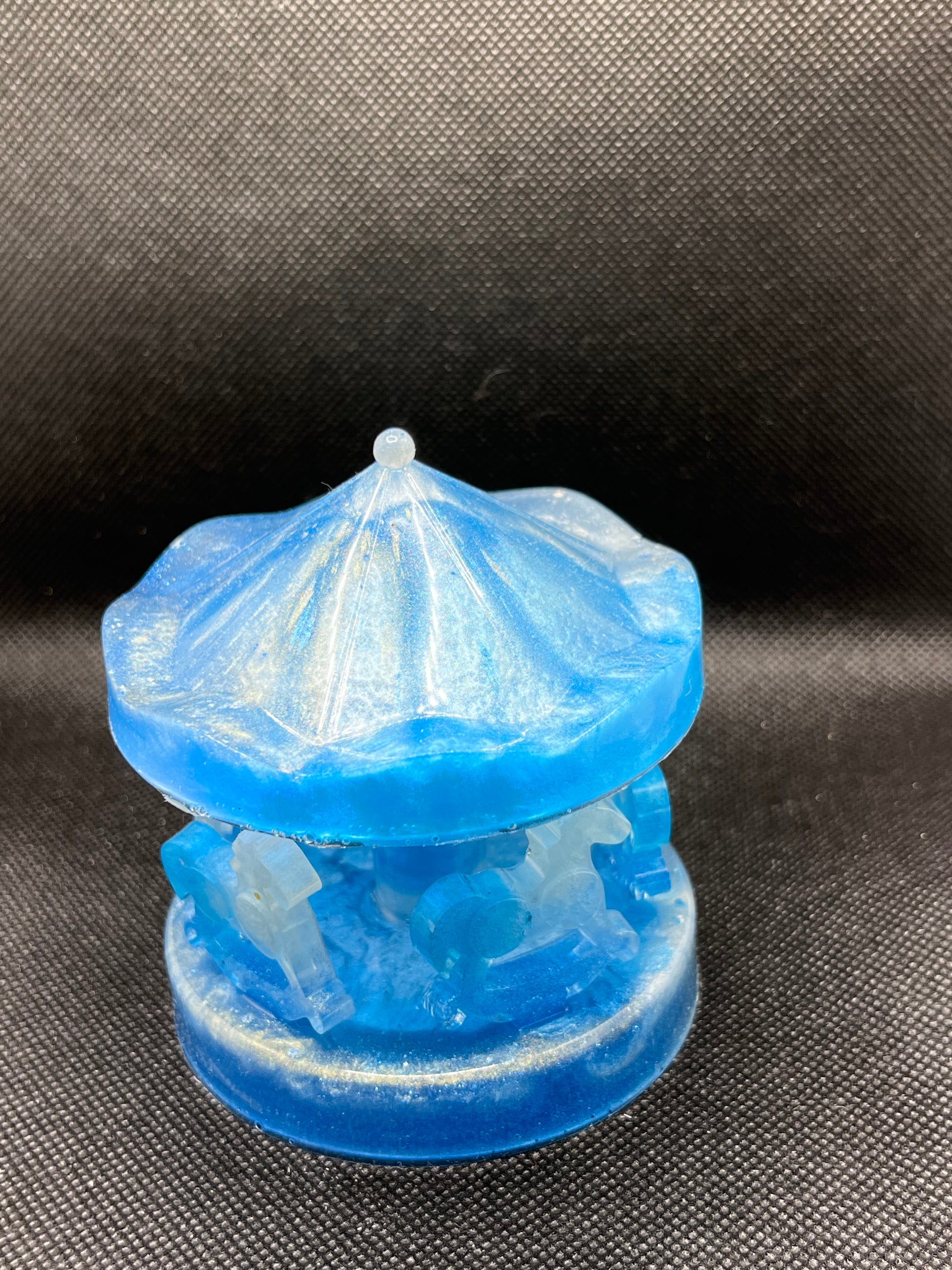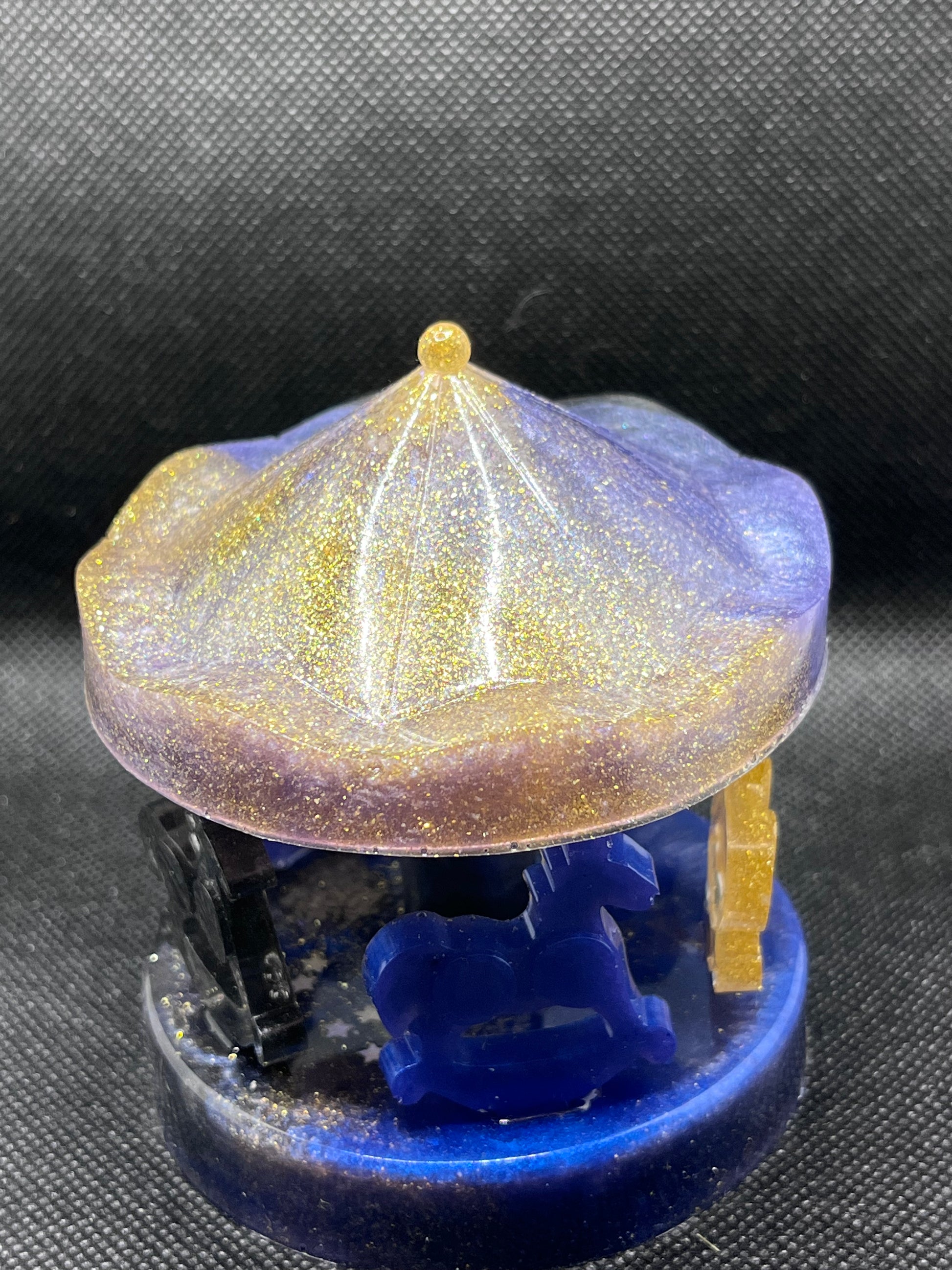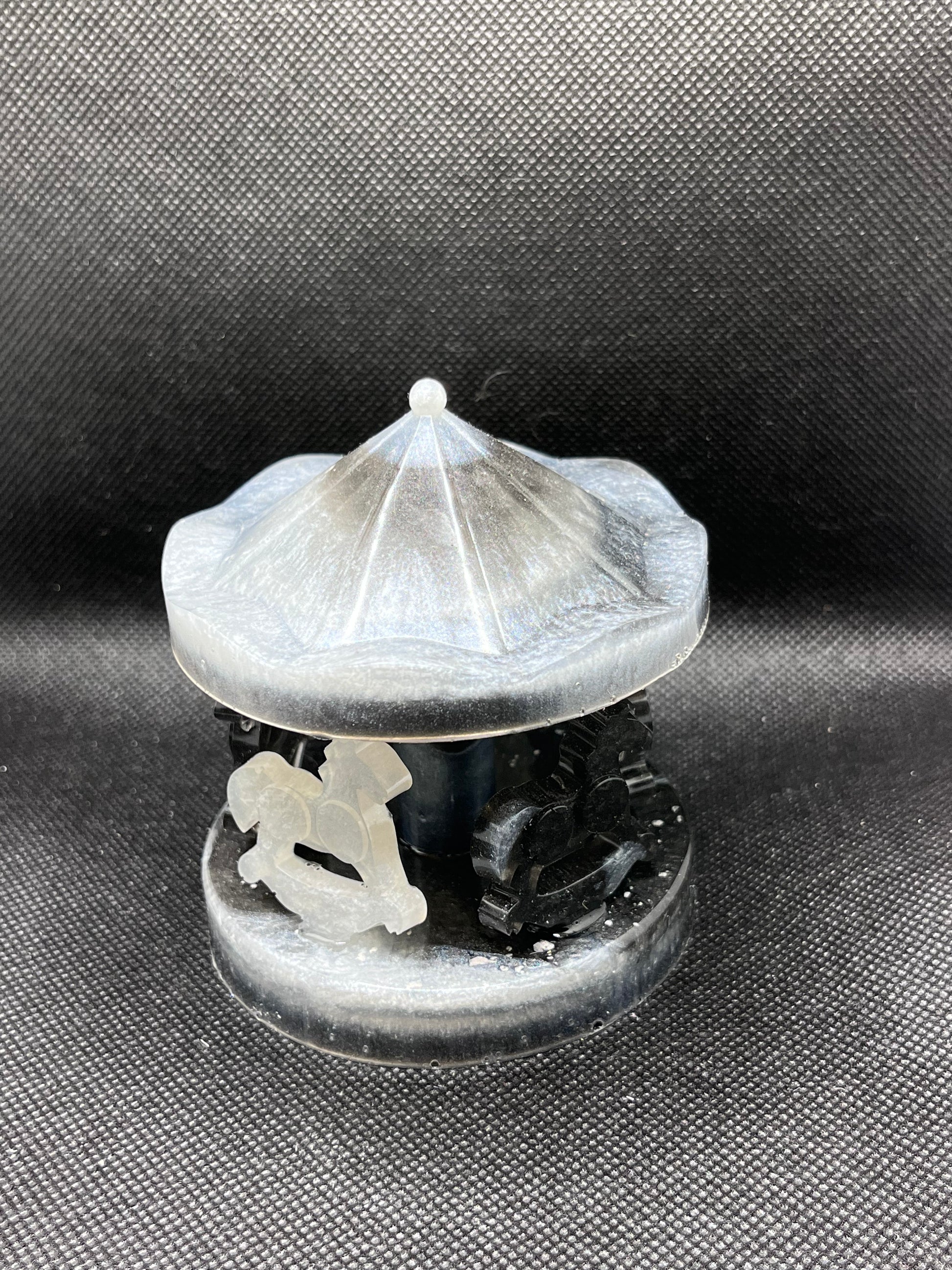 These decorative carousels are made out of resin. They have galloping horses depicted on them. Some have lights embedded in them. If you have a custom color you would like, leave a note at checkout.