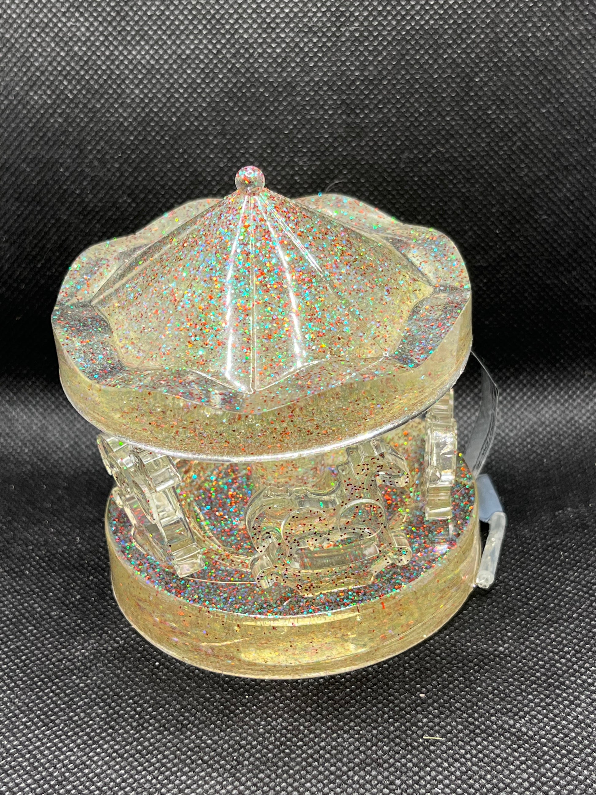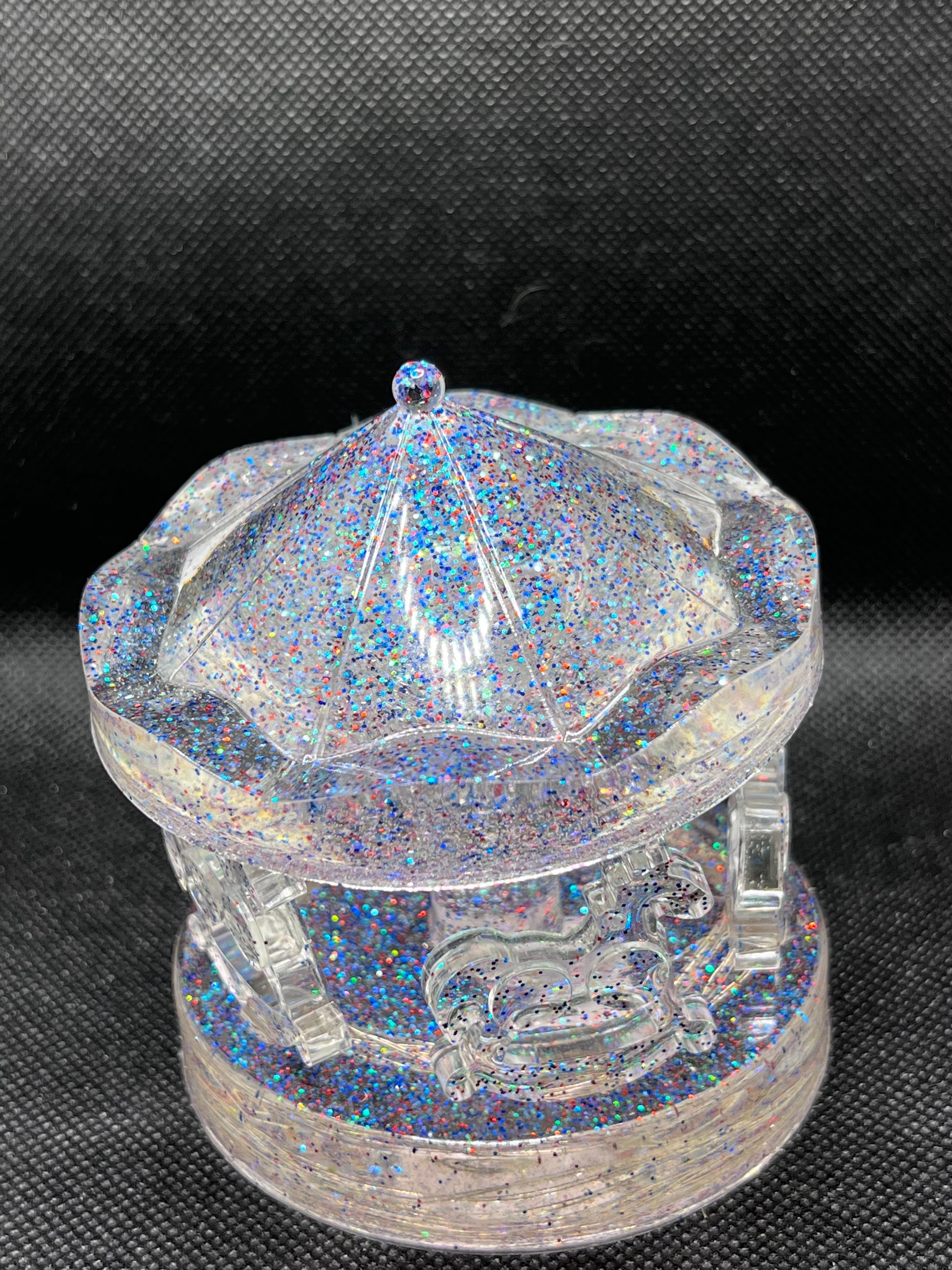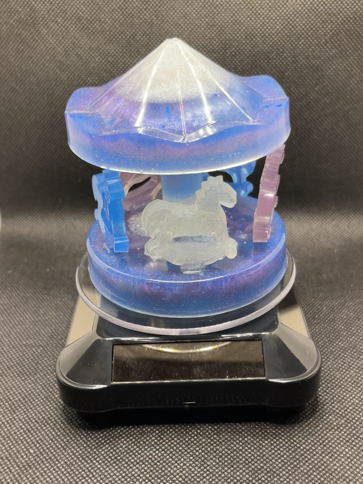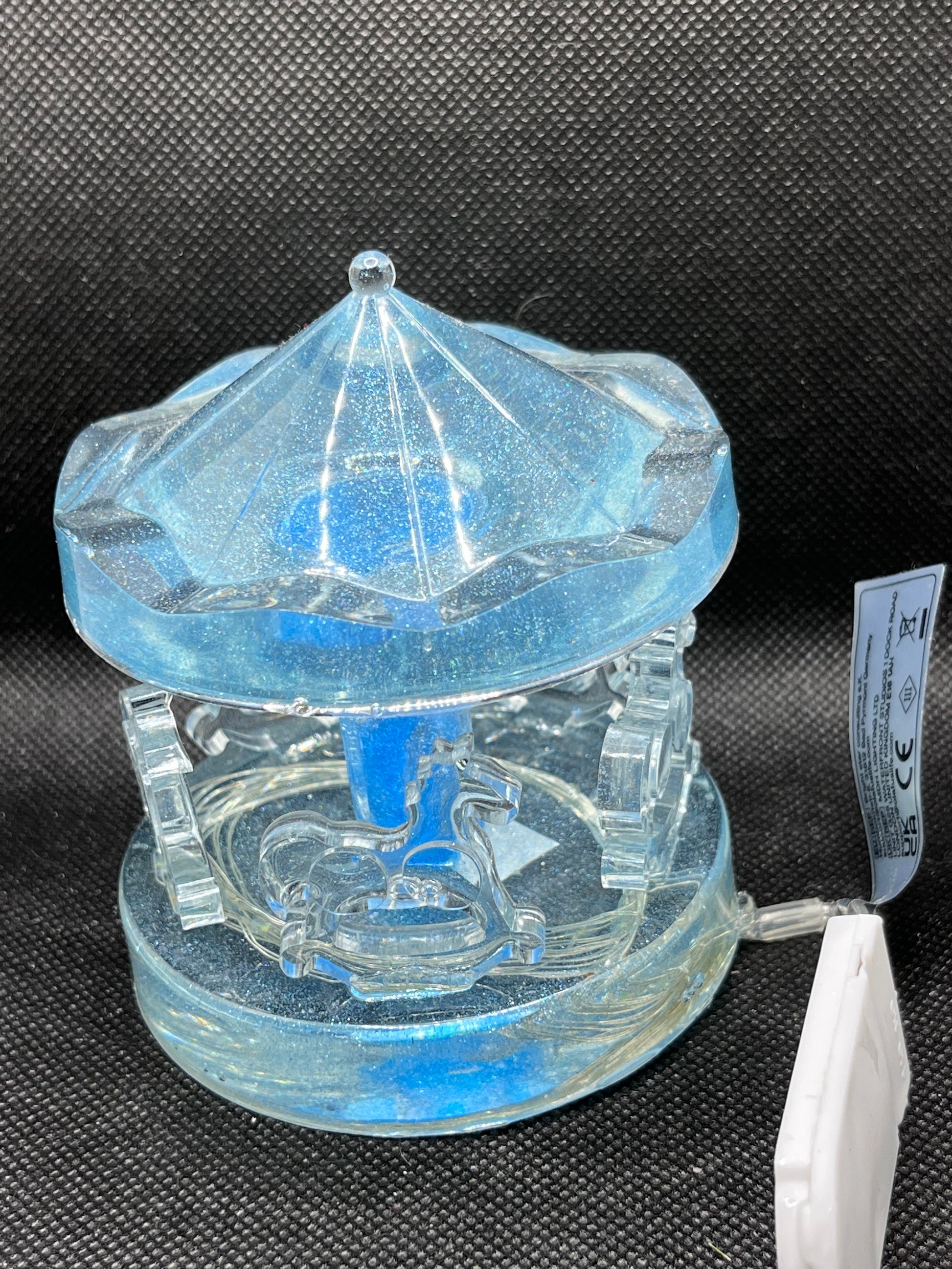 These decorative carousels are made out of resin. They have galloping horses depicted on them. Some have lights embedded in them. If you have a custom color you would like, leave a note at checkout.