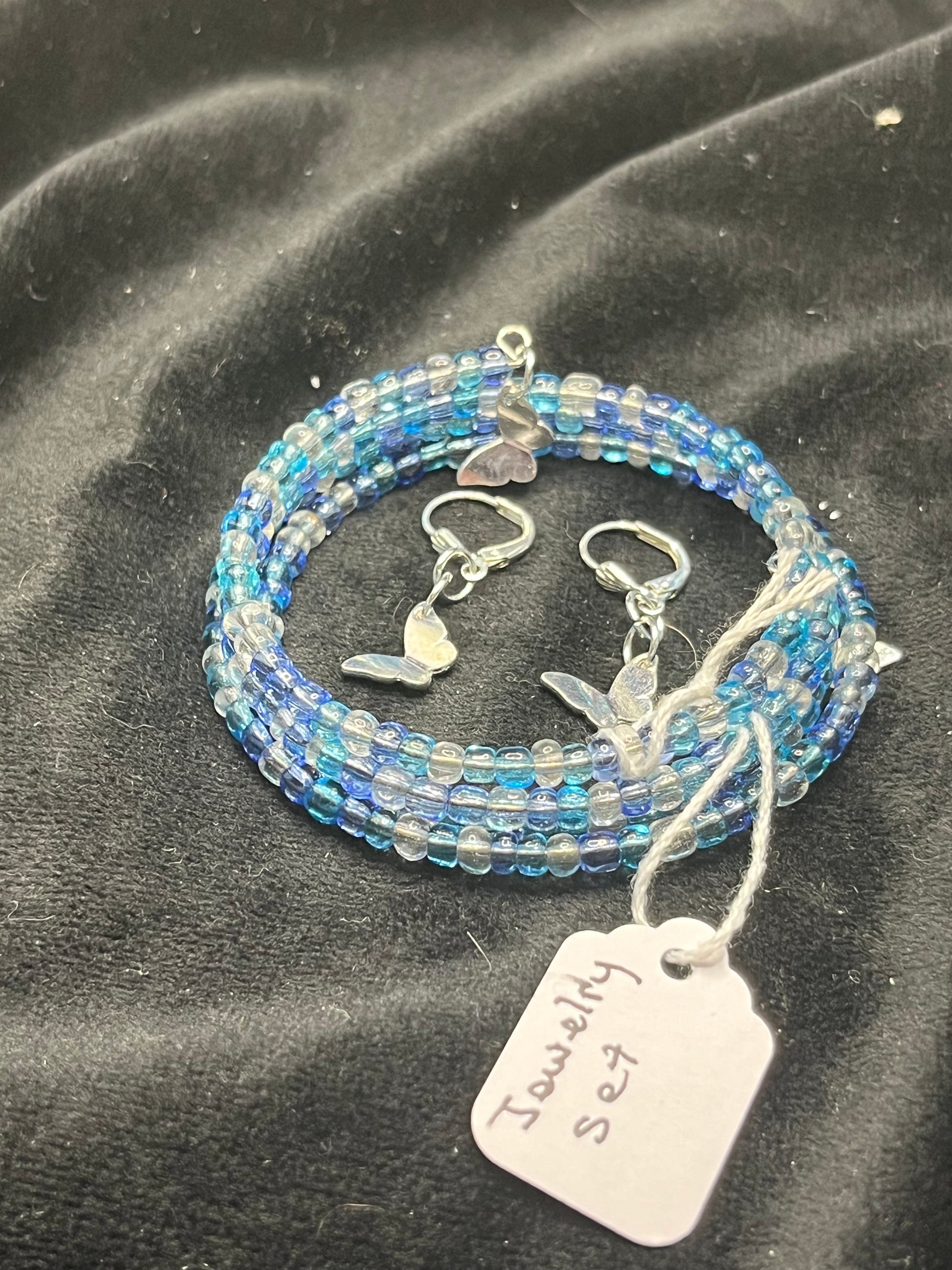 Memory wire bracelet, blue beads and butterfly charms; matching butterfly charm earrings