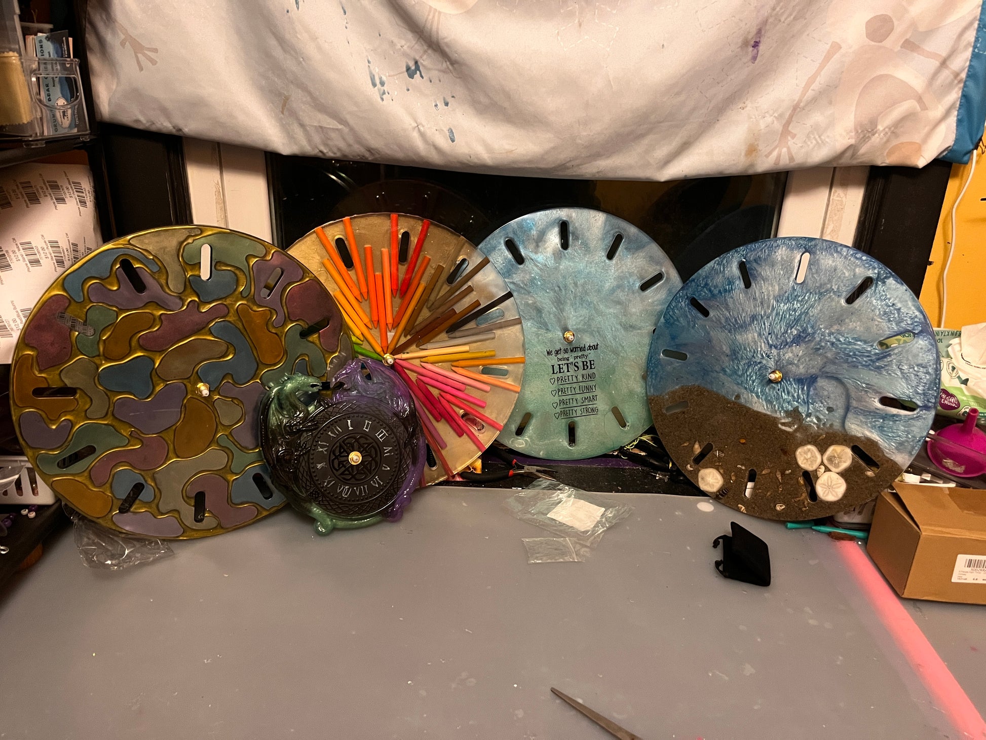 This resin clock measures approximately 13" across. There are simple slits to let you know the time.