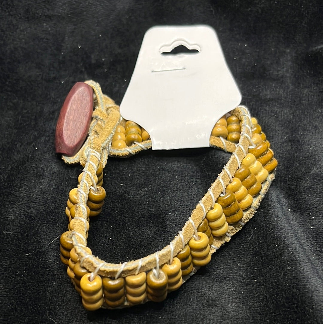 These bracelets have wooden beads on a leather strap. Approx. 7 1/2”