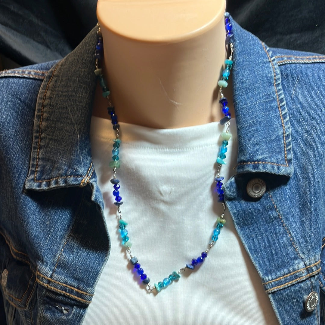 This necklace has blue beads and chipped gemstones linked together with silver wire.