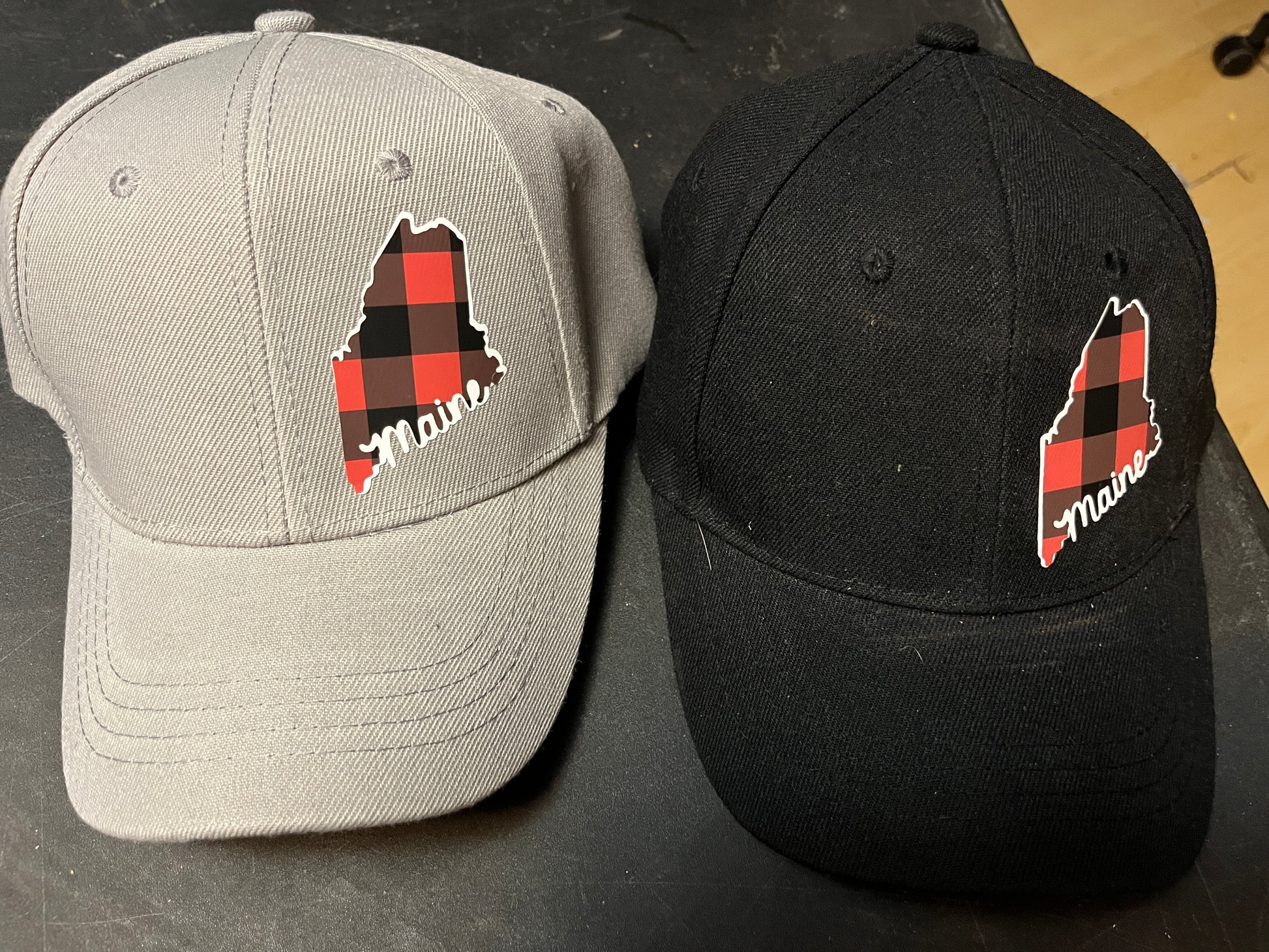 These baseball caps have Maine images on them. 100% polyester, adjustable, with heat transfer final for the images.