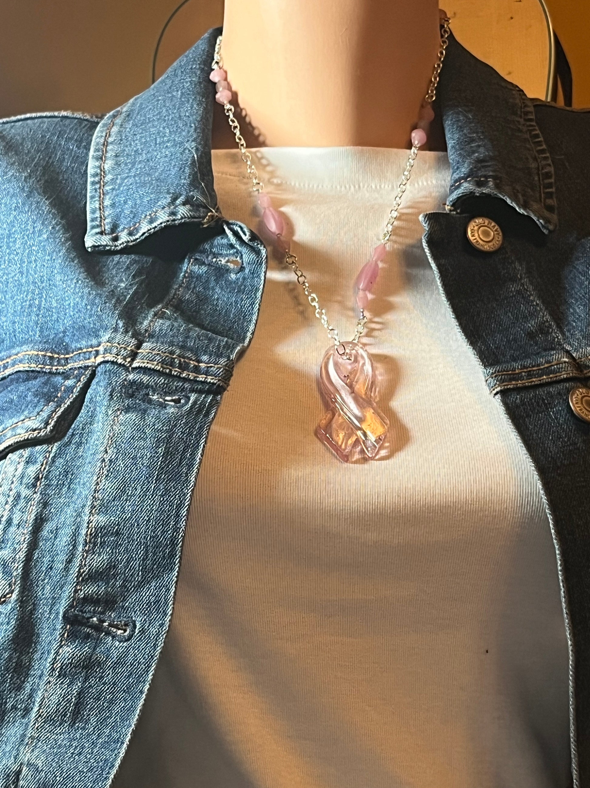 Silver chain, pink bead necklace with large pink awareness ribbon charm