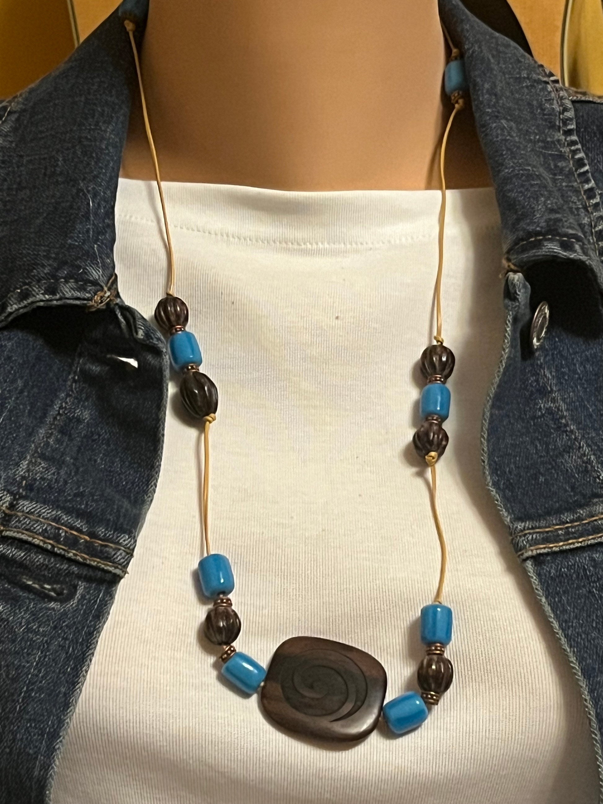 Thin cord with blue and brown bead necklace with brown pendant with etched spiral