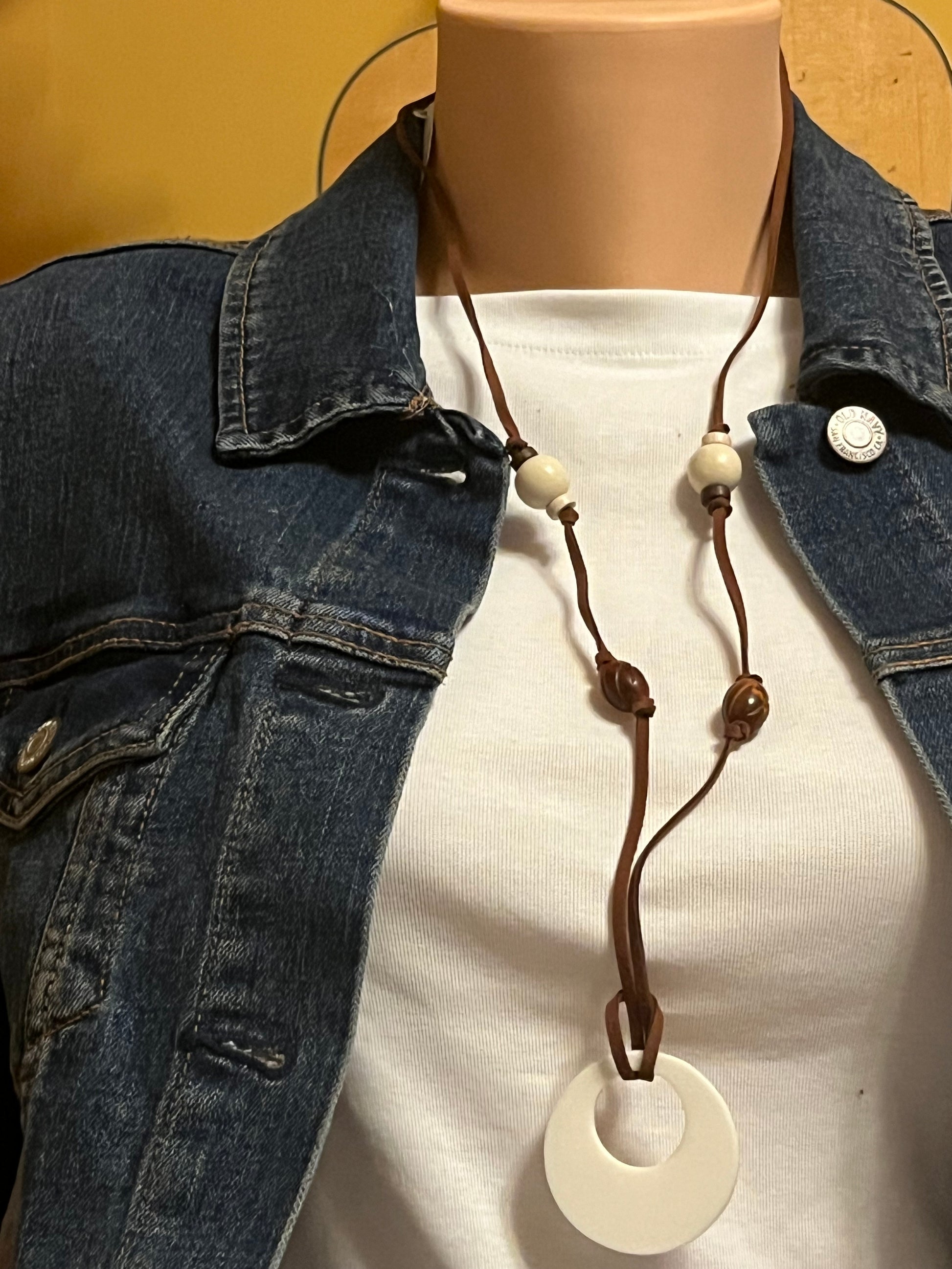 Brown leather cord necklace with earth-tone beads and circle focal bead