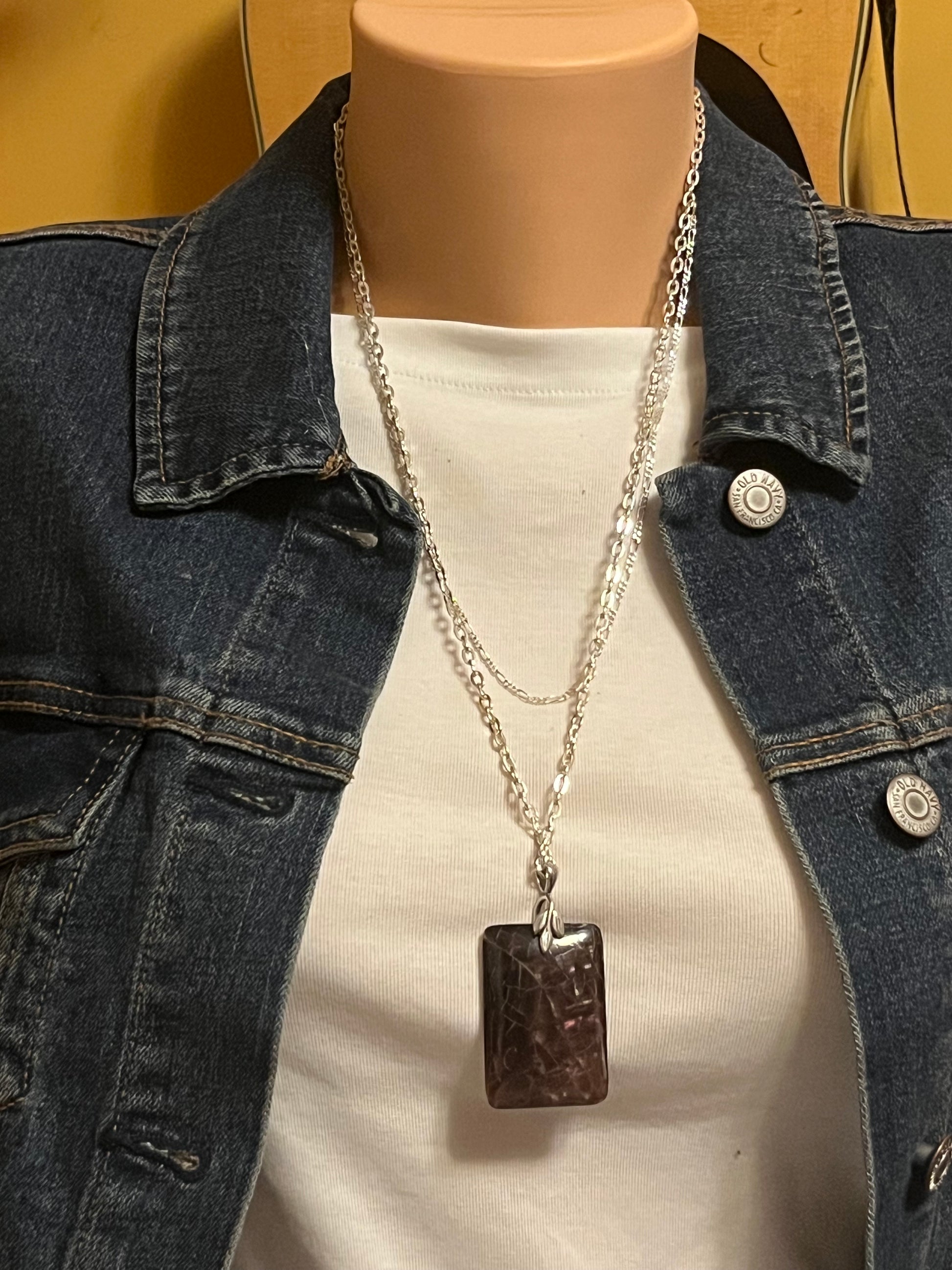 Silver chain necklace with brown rectangle pendant