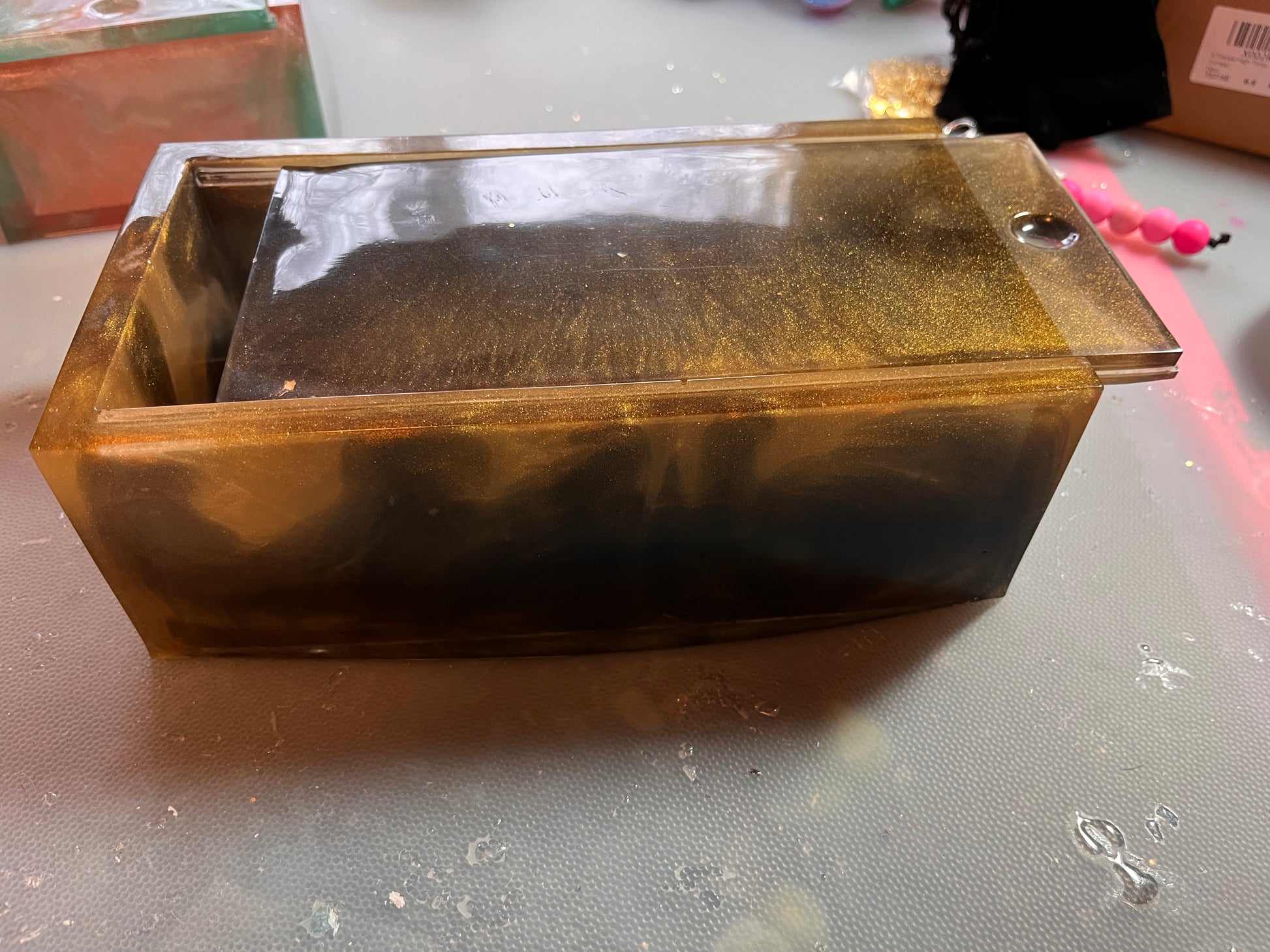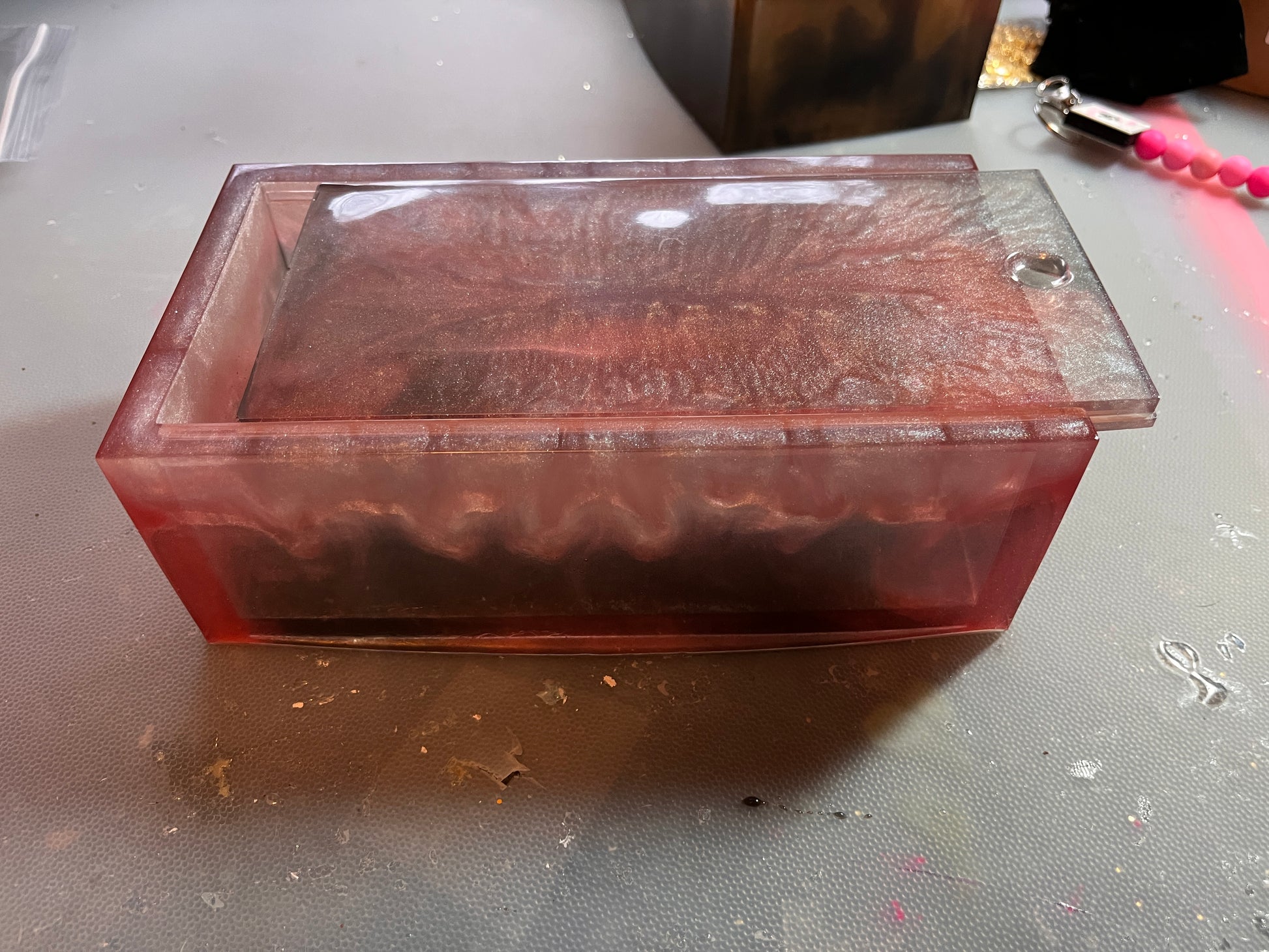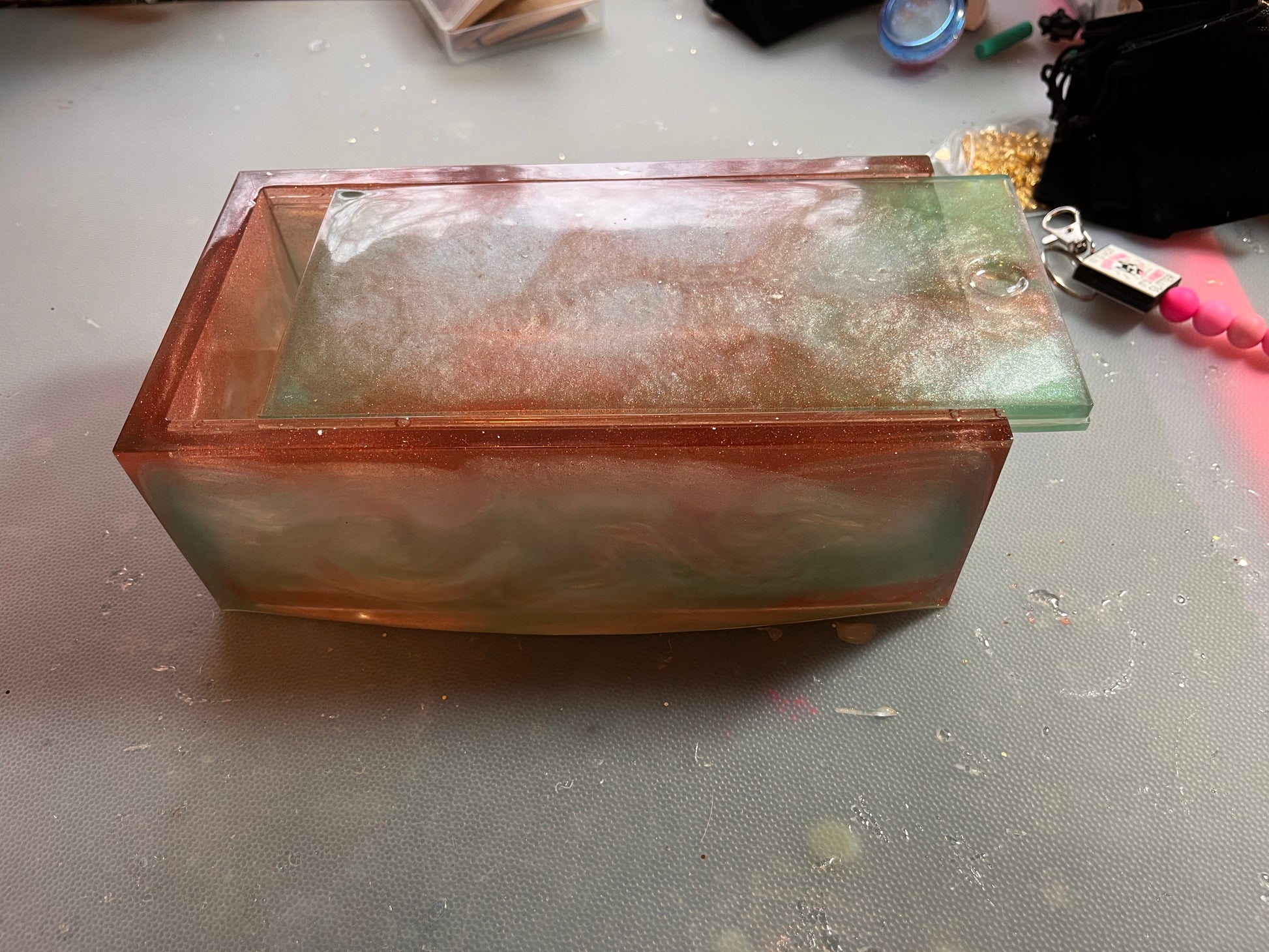This box is roughly 9"x5"x2".  It has a lid that slides in to close the box.