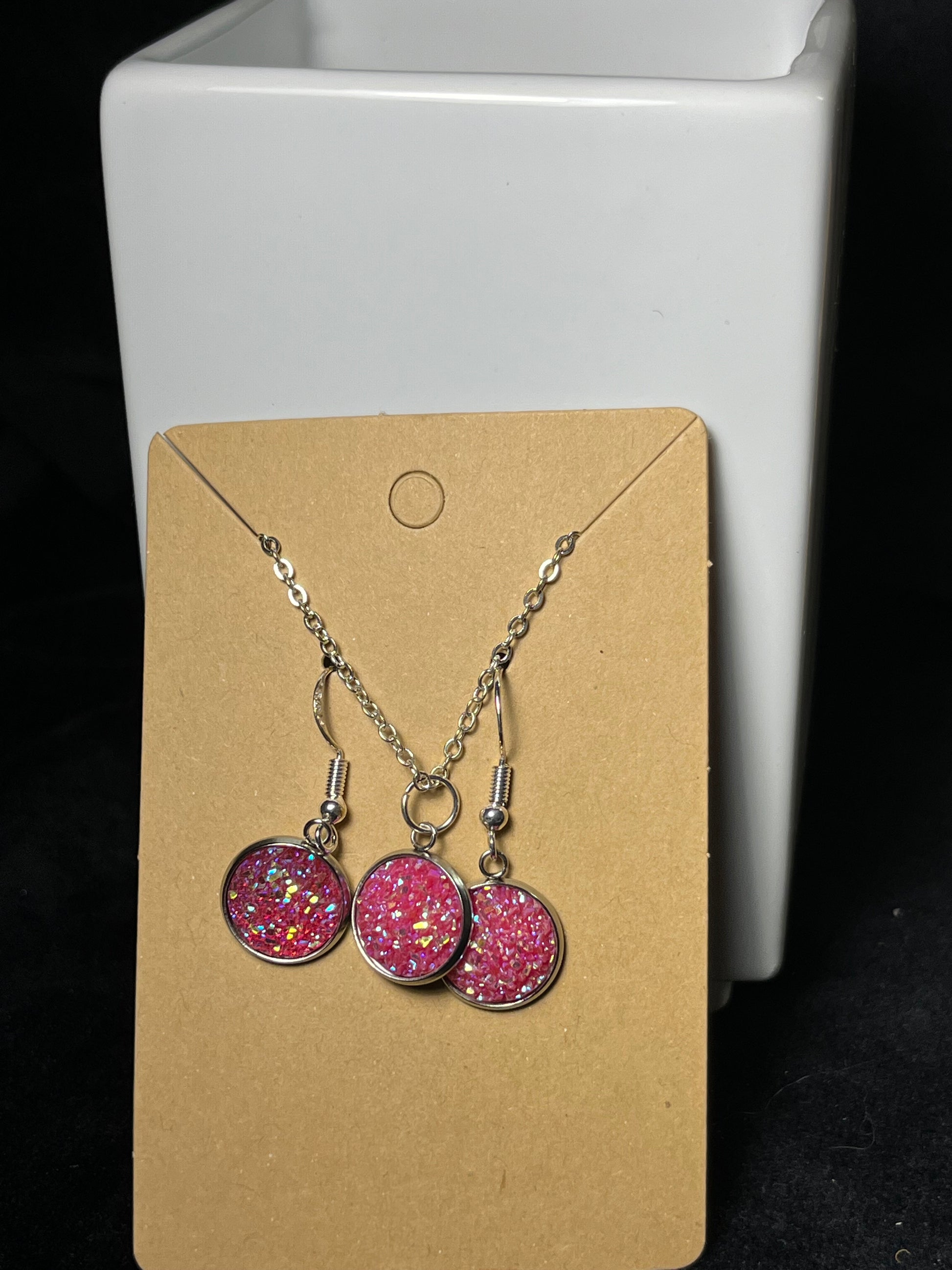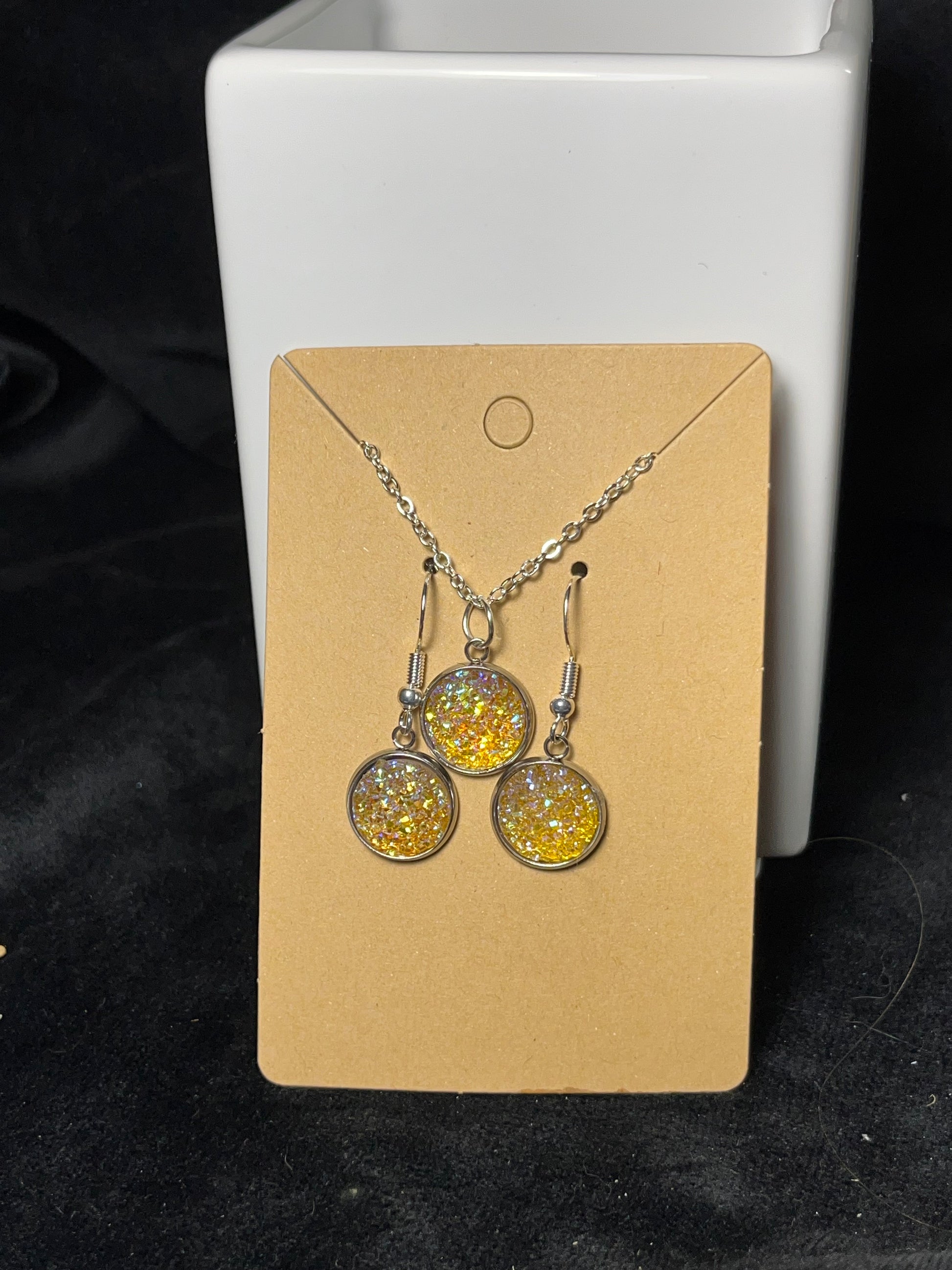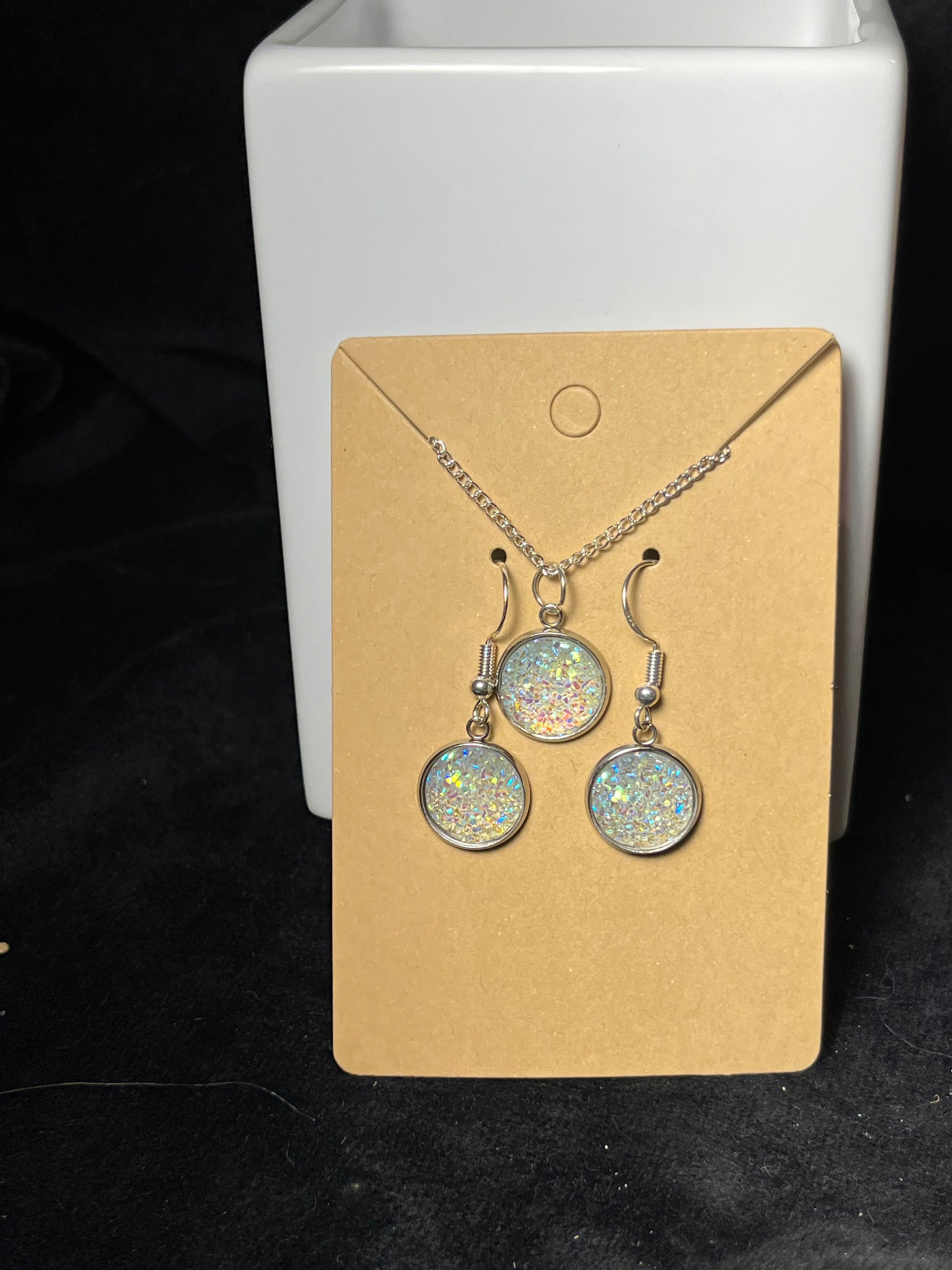 Sparkly Round Cabochon on a silver Chain Necklace with Matching Stud Earrings