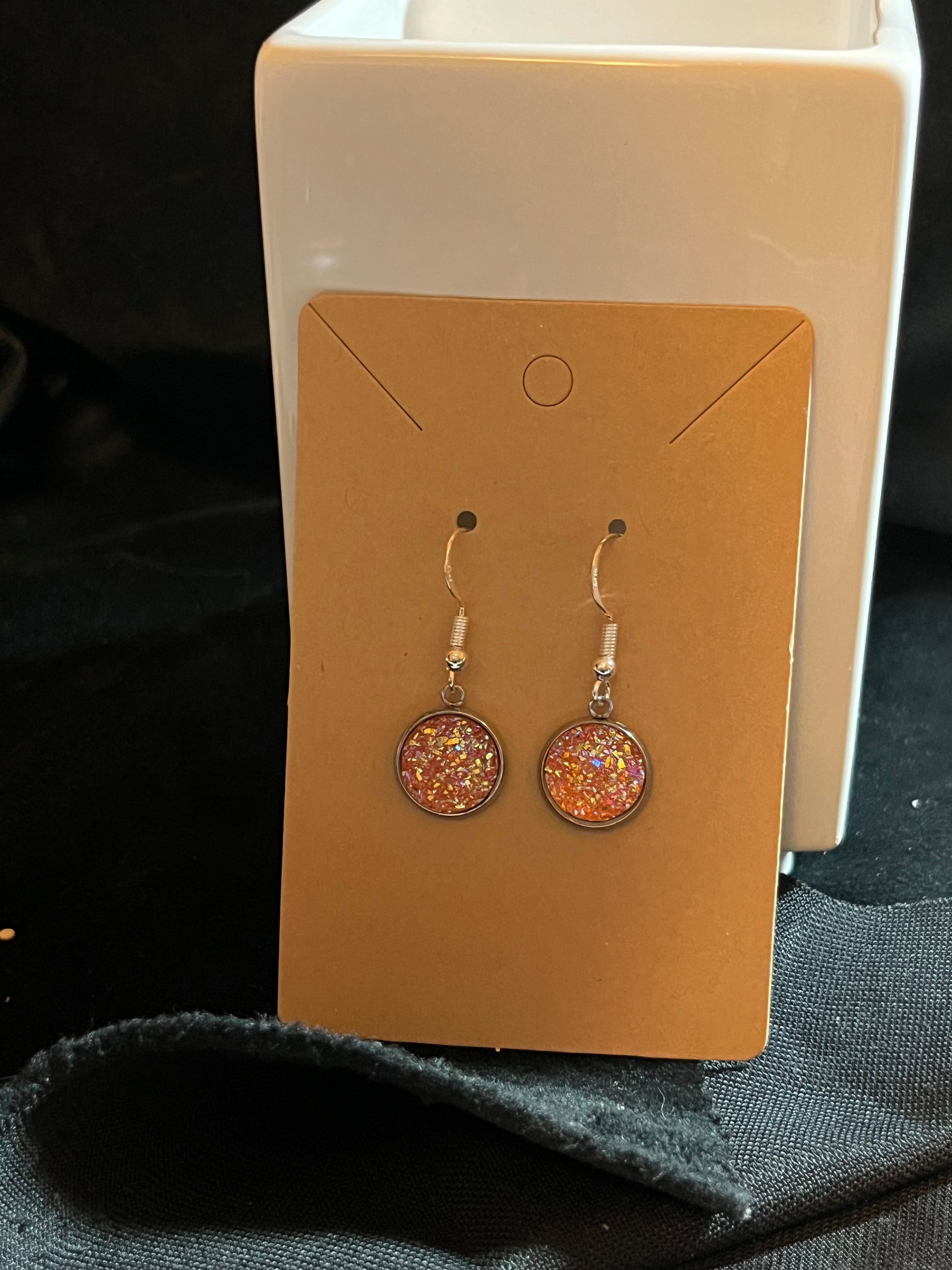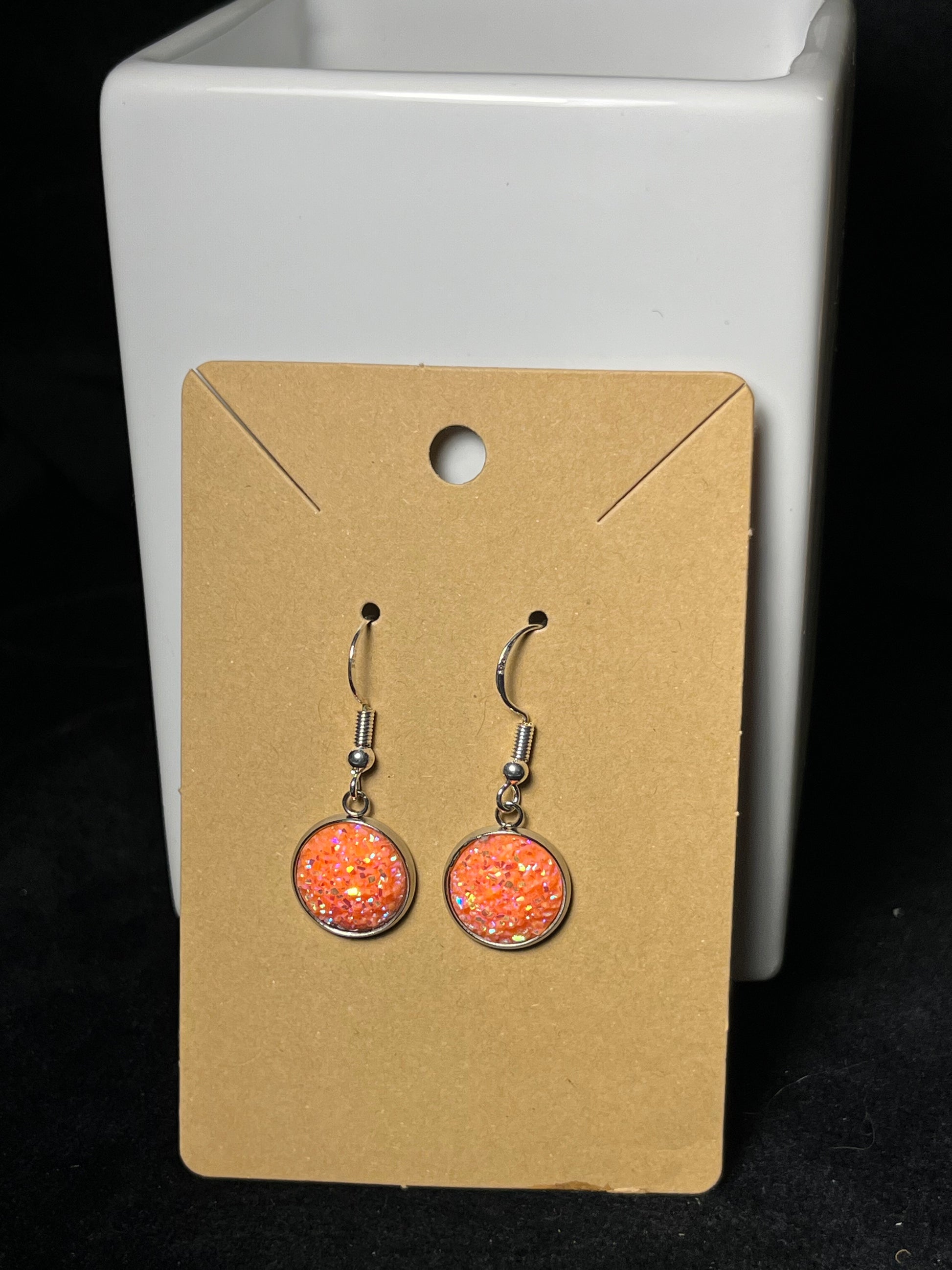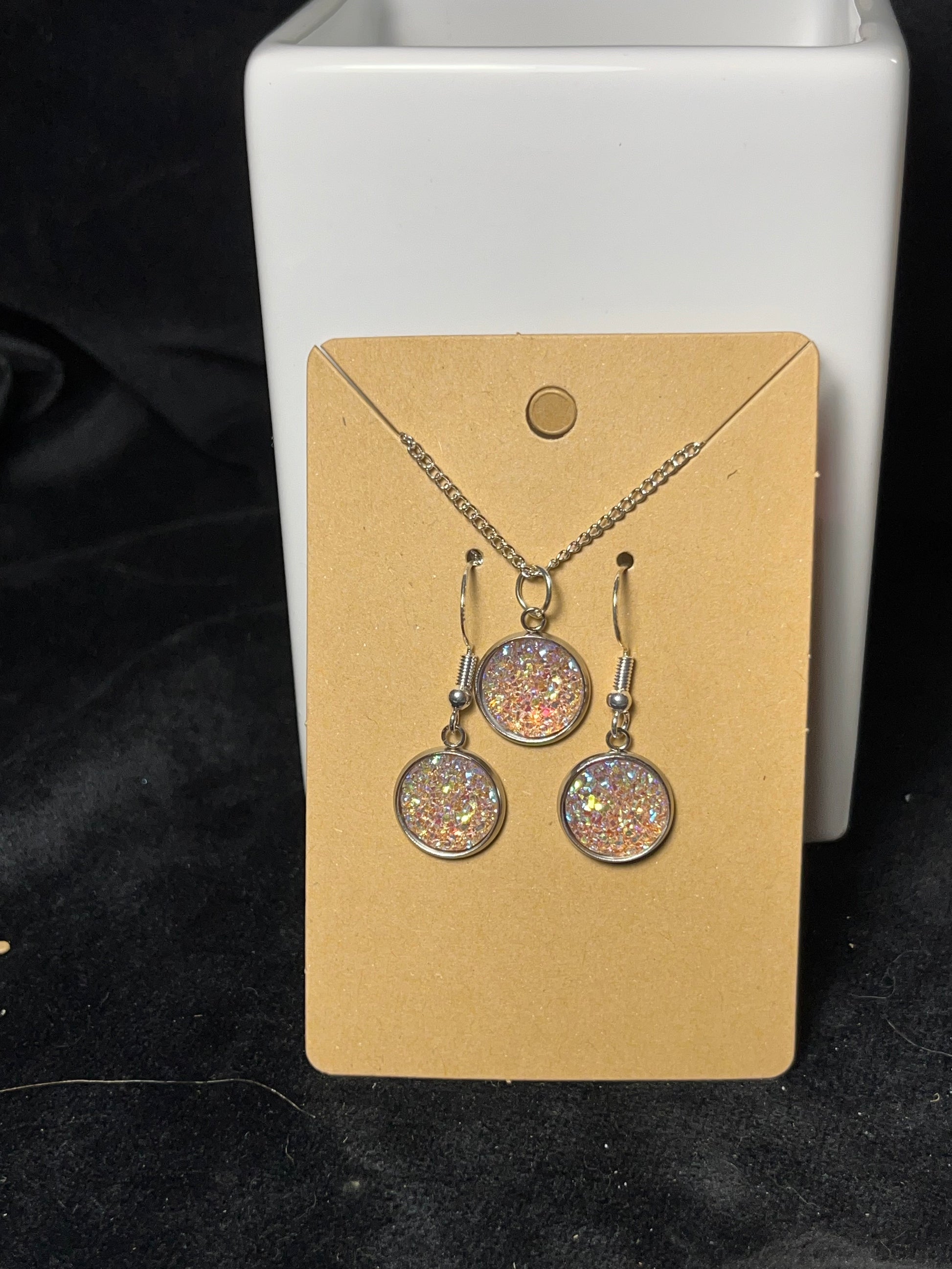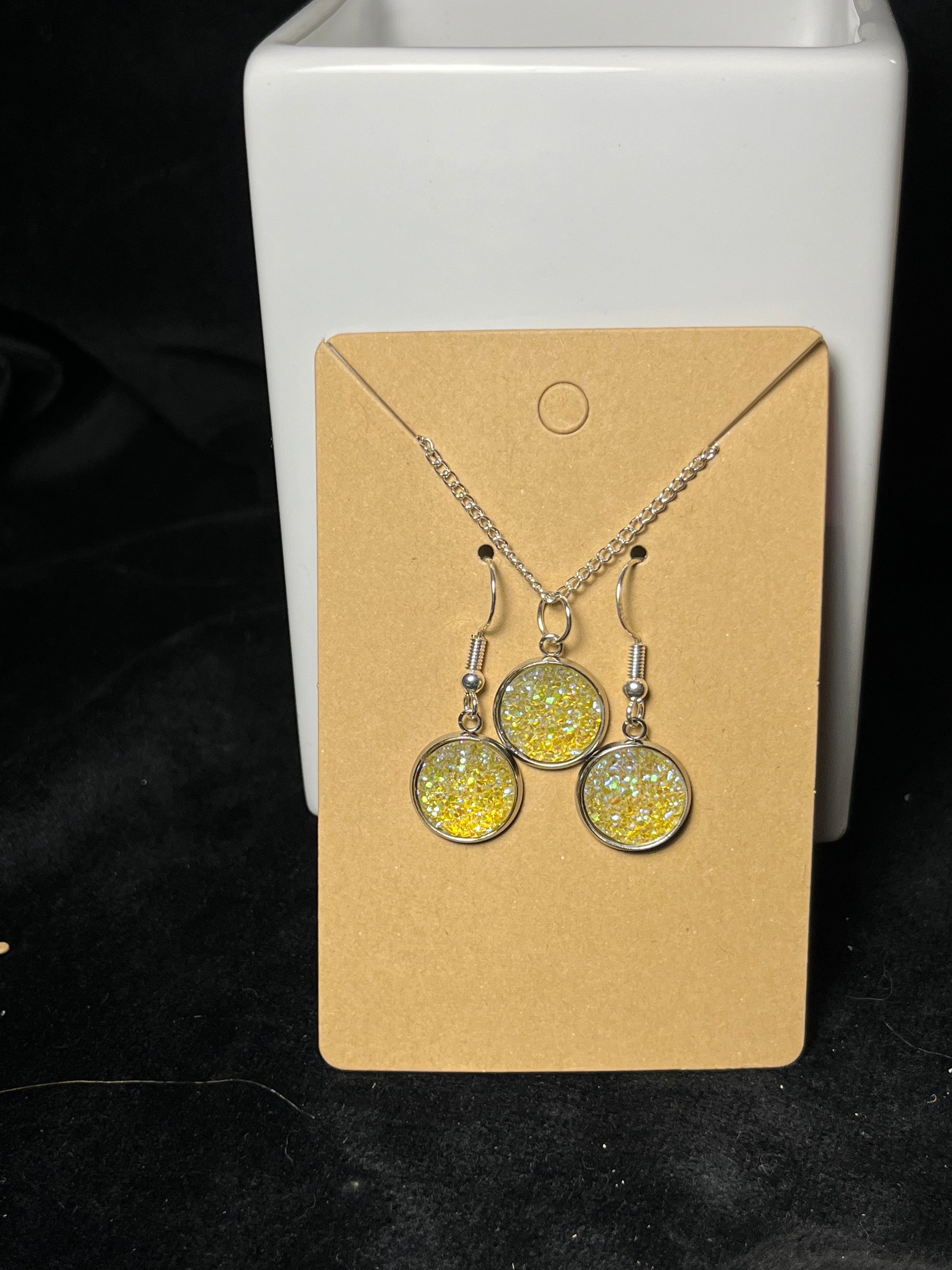 Sparkly Round Cabochon on a silver Chain Necklace with Matching Stud Earrings